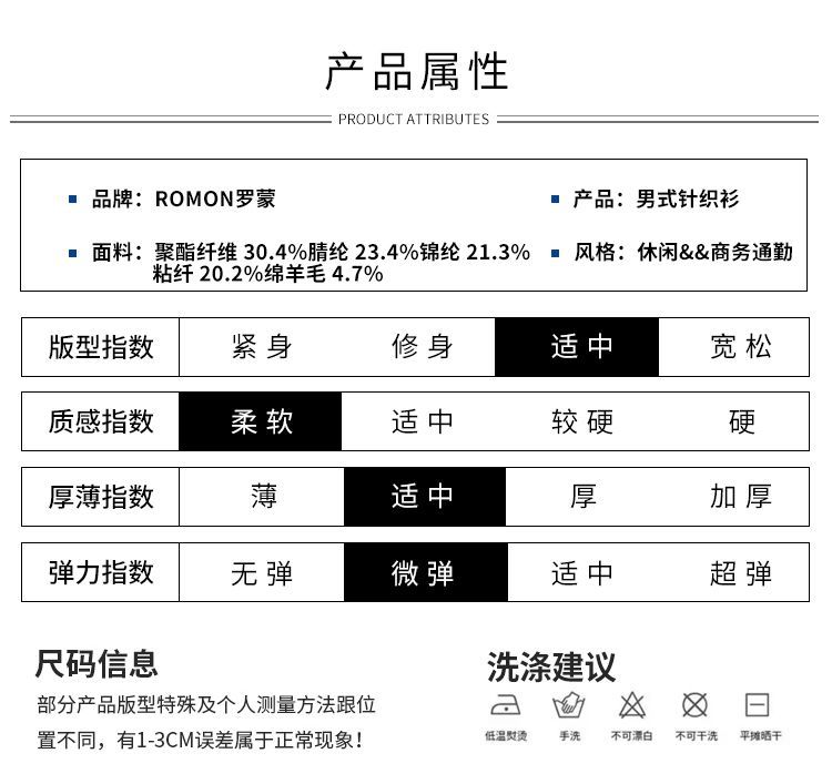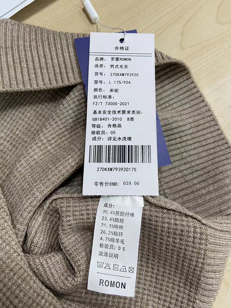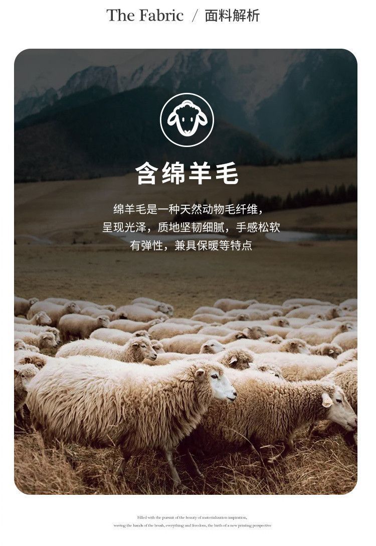面料:聚酯纤维 30.4%腈纶 23.4%锦纶 21.3%粘纤 20.2%绵羊毛 4.7%
