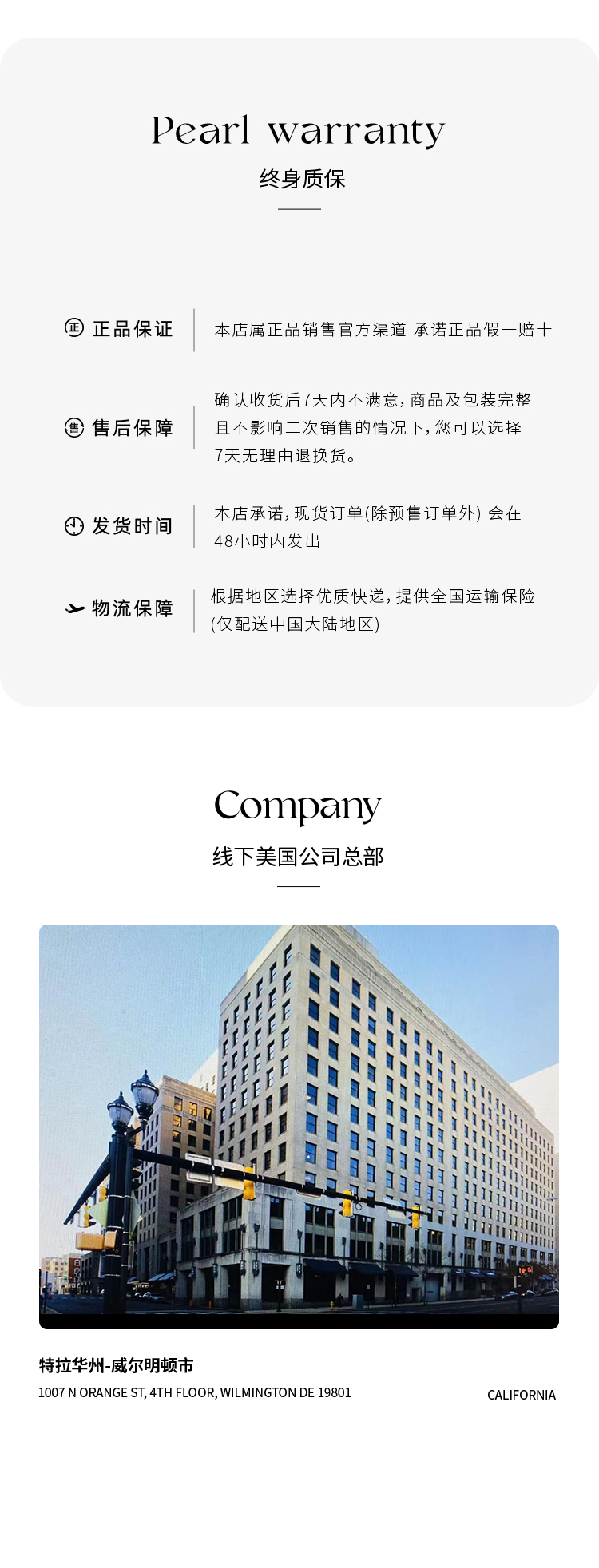 【生产日期/保质期】本品牌饰品保修时间为一年,配饰保修为一年,非商品质量问题保修期间内需承担来回运费,超出保修时间需要承担维修费用