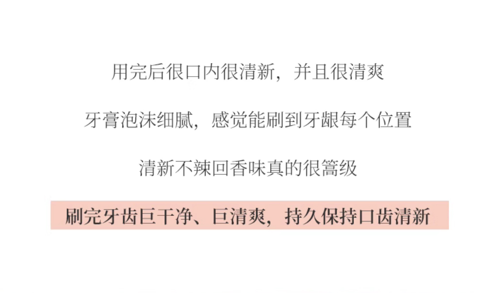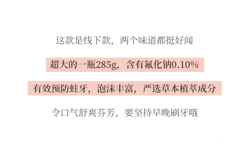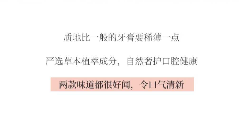 按压式设计,轻轻一按直接开刷,不用经过传统牙膏旋盖拧盖的复杂步骤,使用超方便!含0.1%微量氟化钠,防蛀呵护牙龈!草本植萃,清新口气,去除异味!减少增稠剂,降低对牙齿的伤害,开启你的健康新生活!
