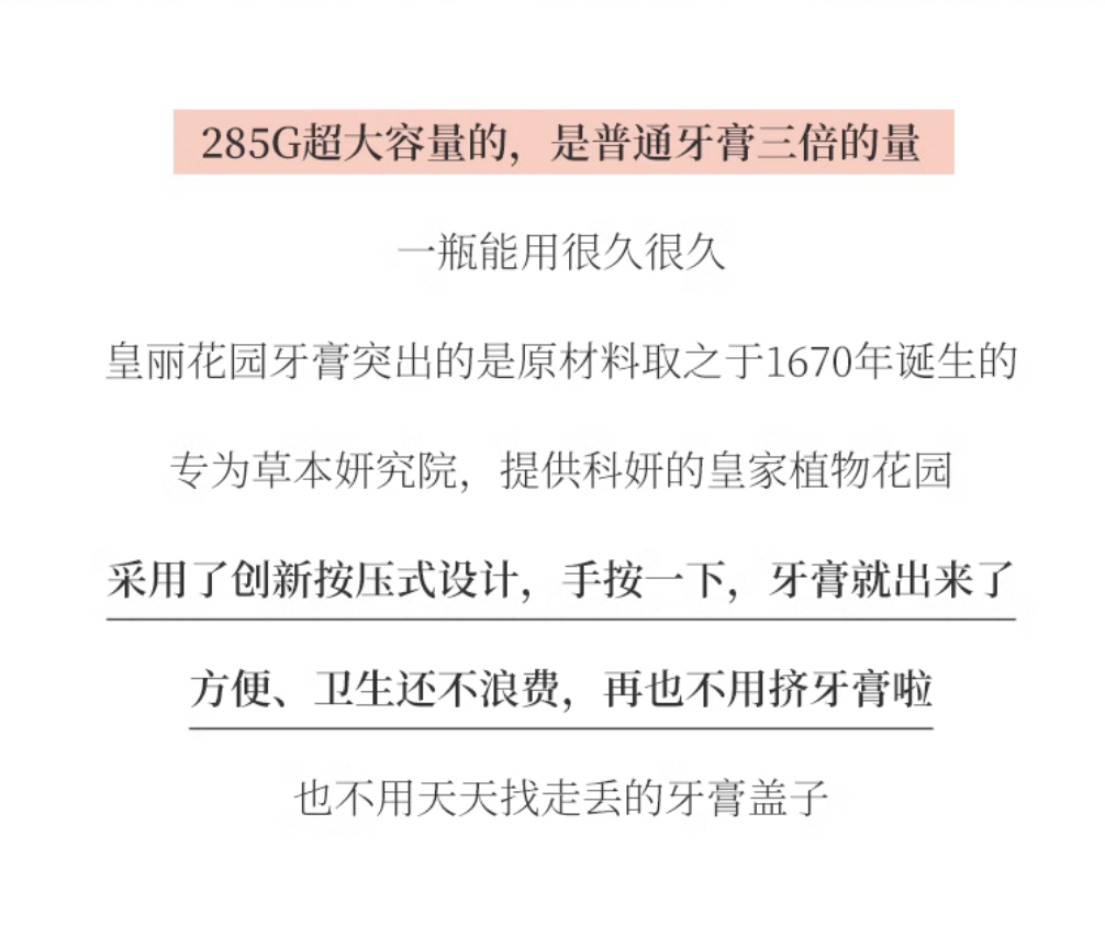 来自LG旗下的倍瑞傲,皇丽花园是线下专享款,它是半透明凝乳质地夹杂着草本颗粒,清洁除口气效果更显著!足足285g大容量!高端不贵,天天用都不心疼了!