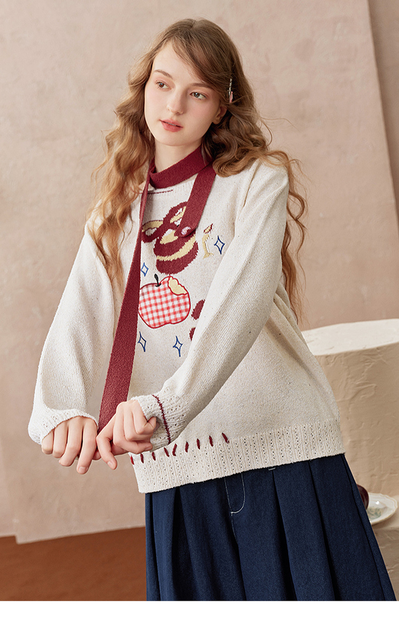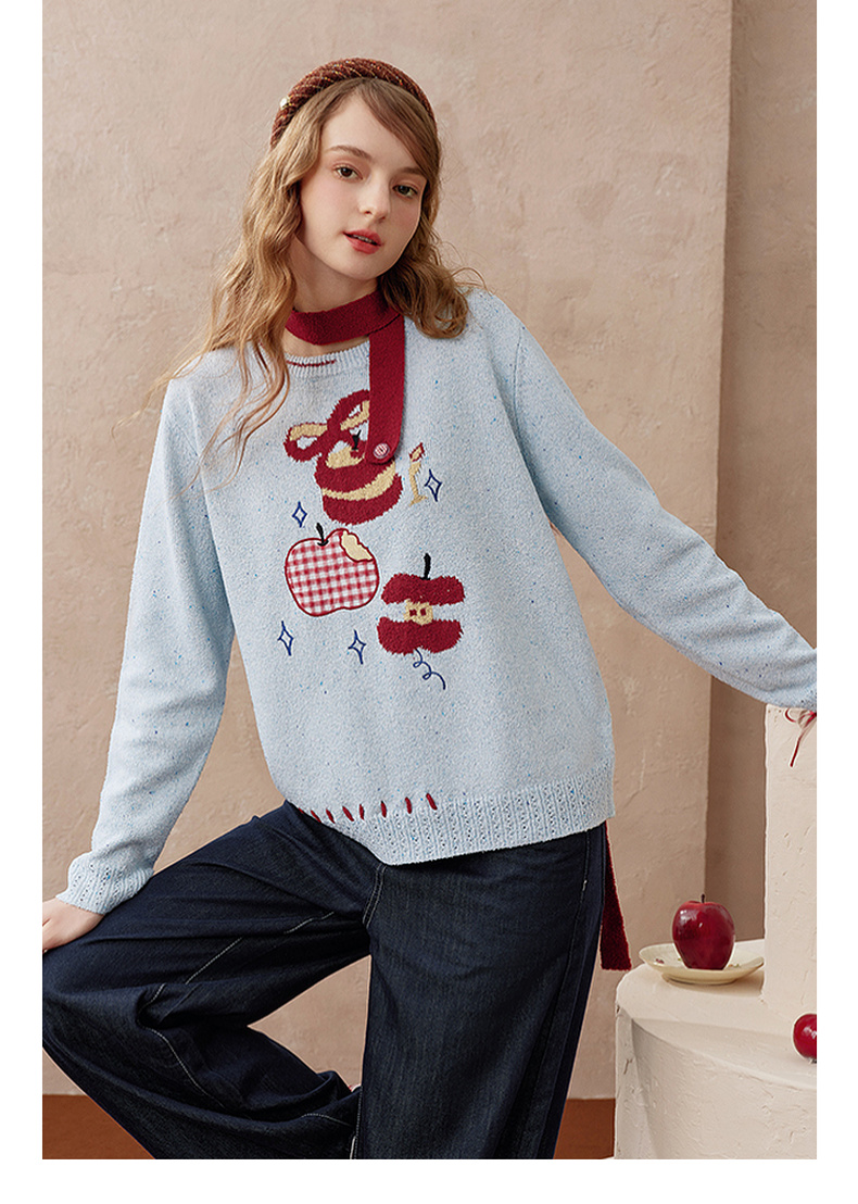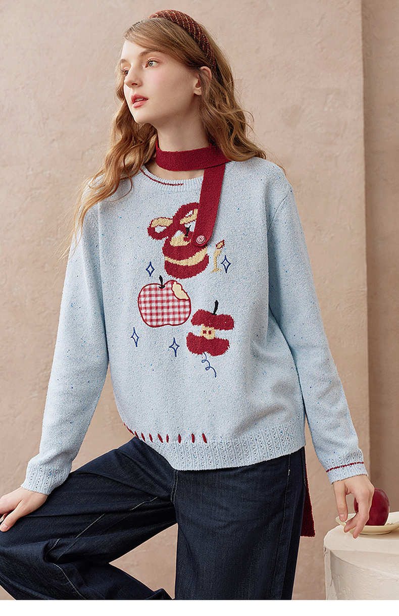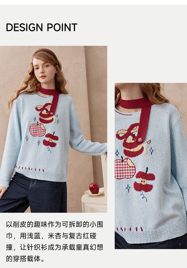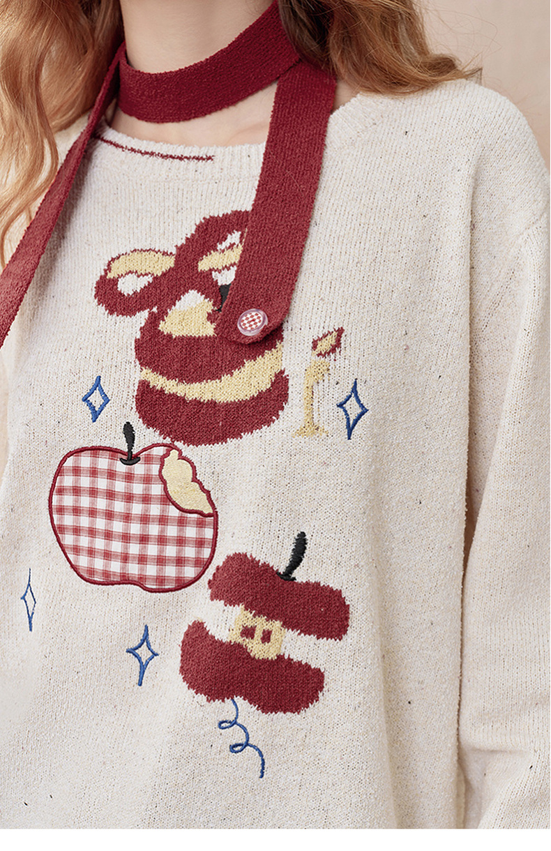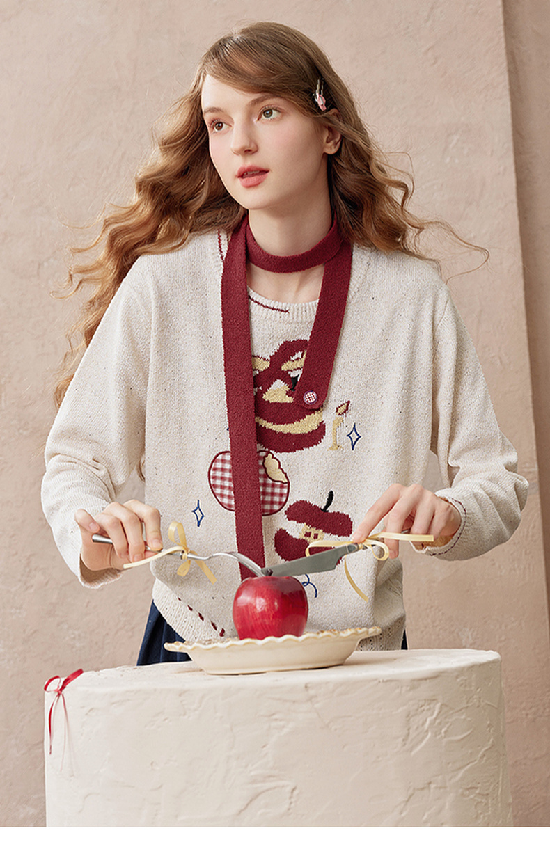 两三事 云绒苹谣 2025秋季新款趣味苹果贴布绣图案针织衫女配围巾