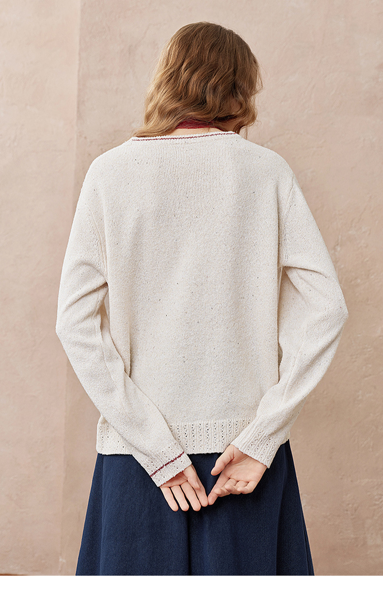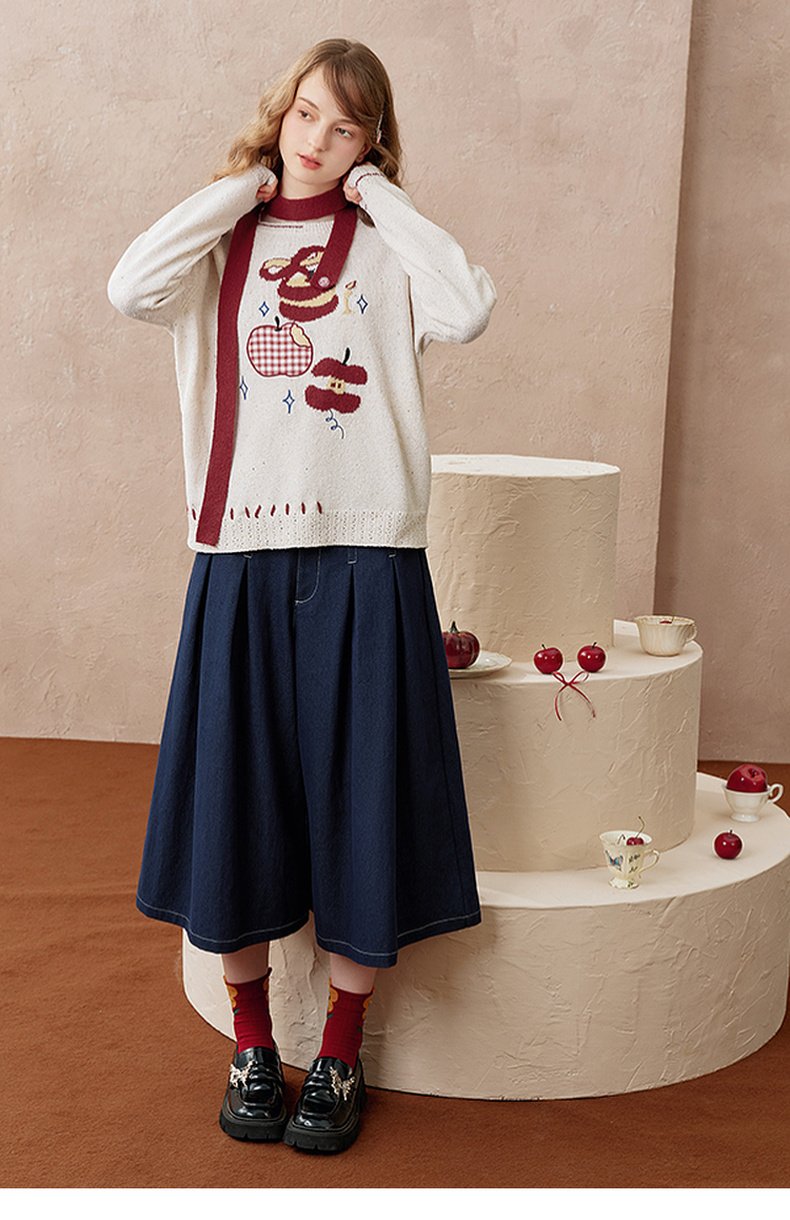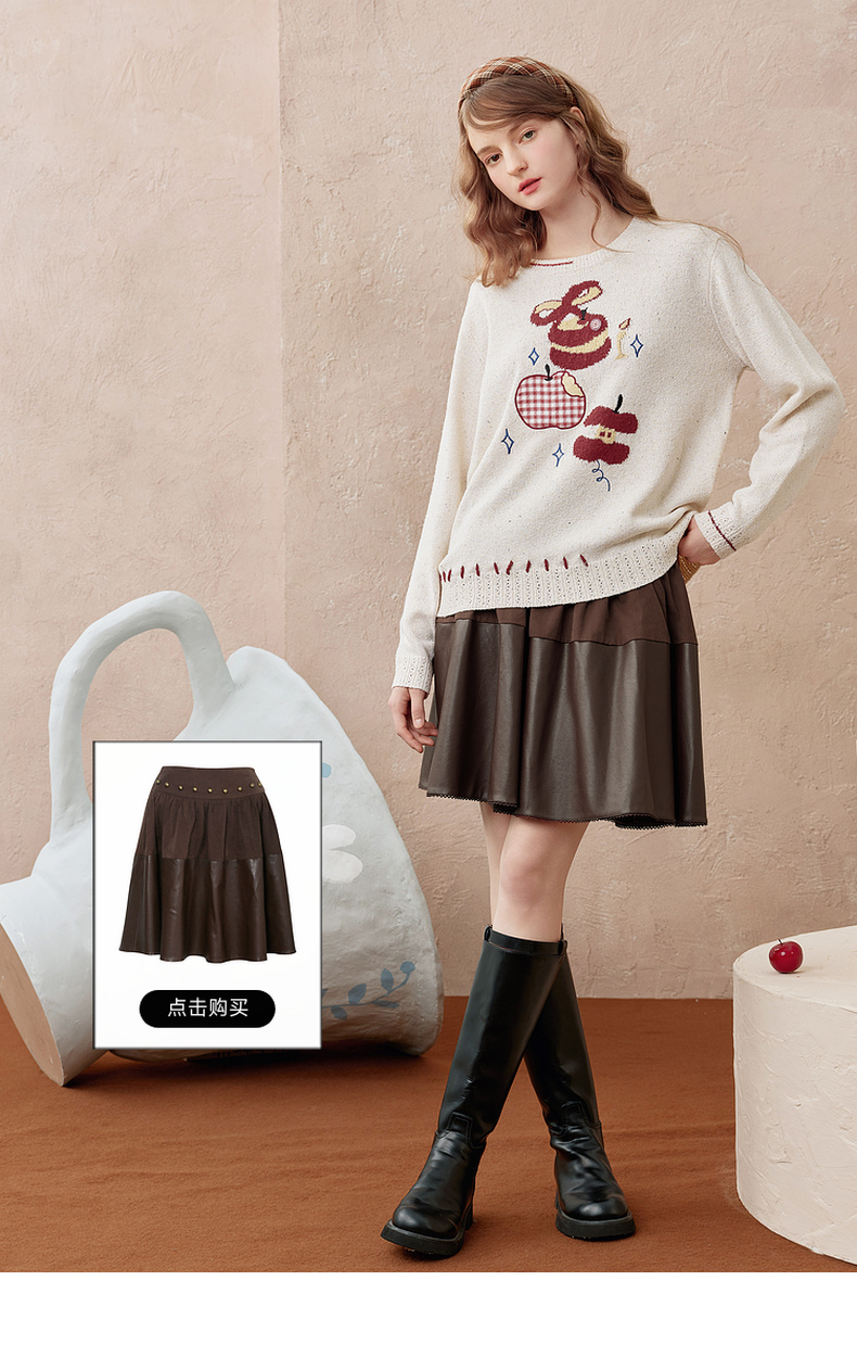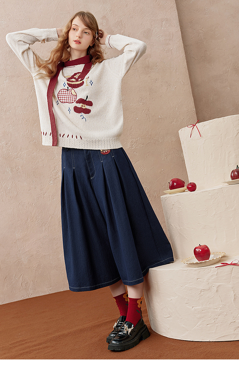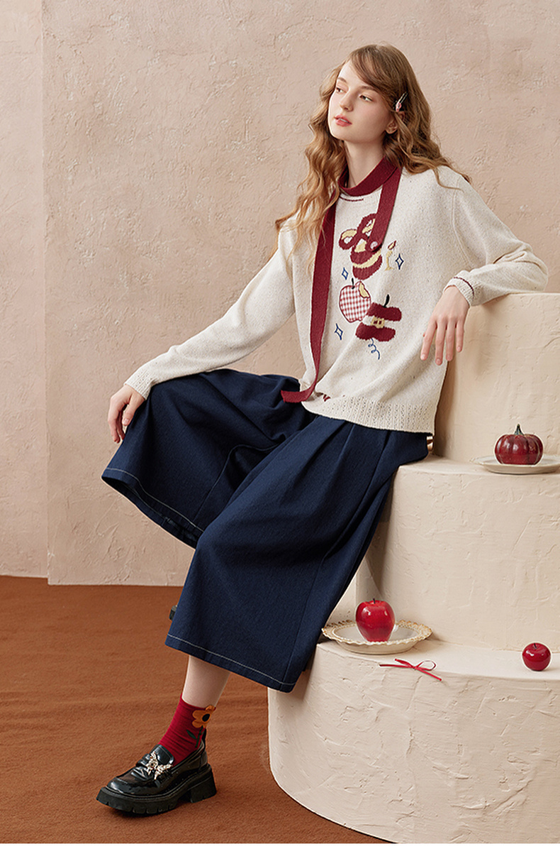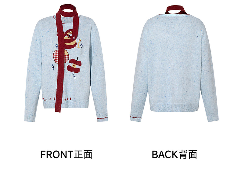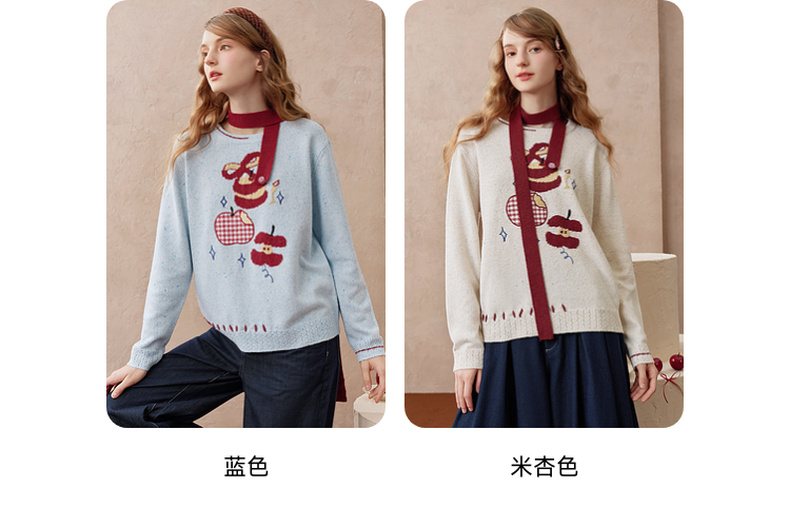 两三事 云绒苹谣 2025秋季新款趣味苹果贴布绣图案针织衫女配围巾