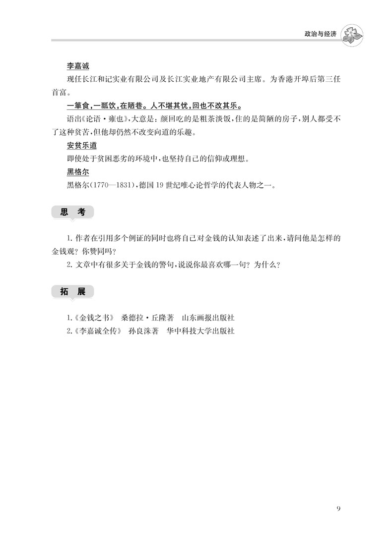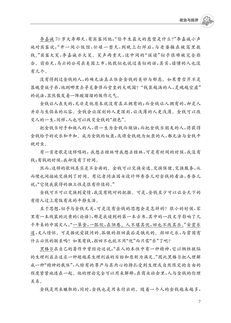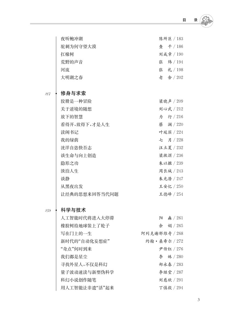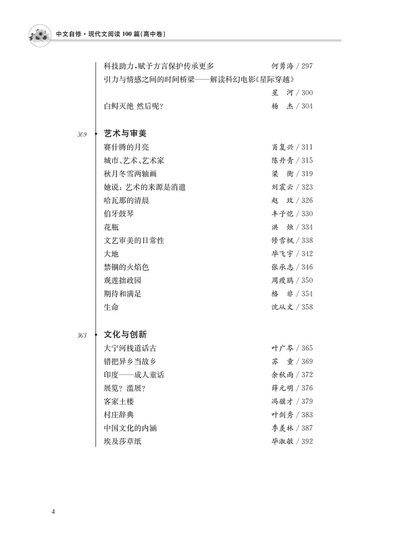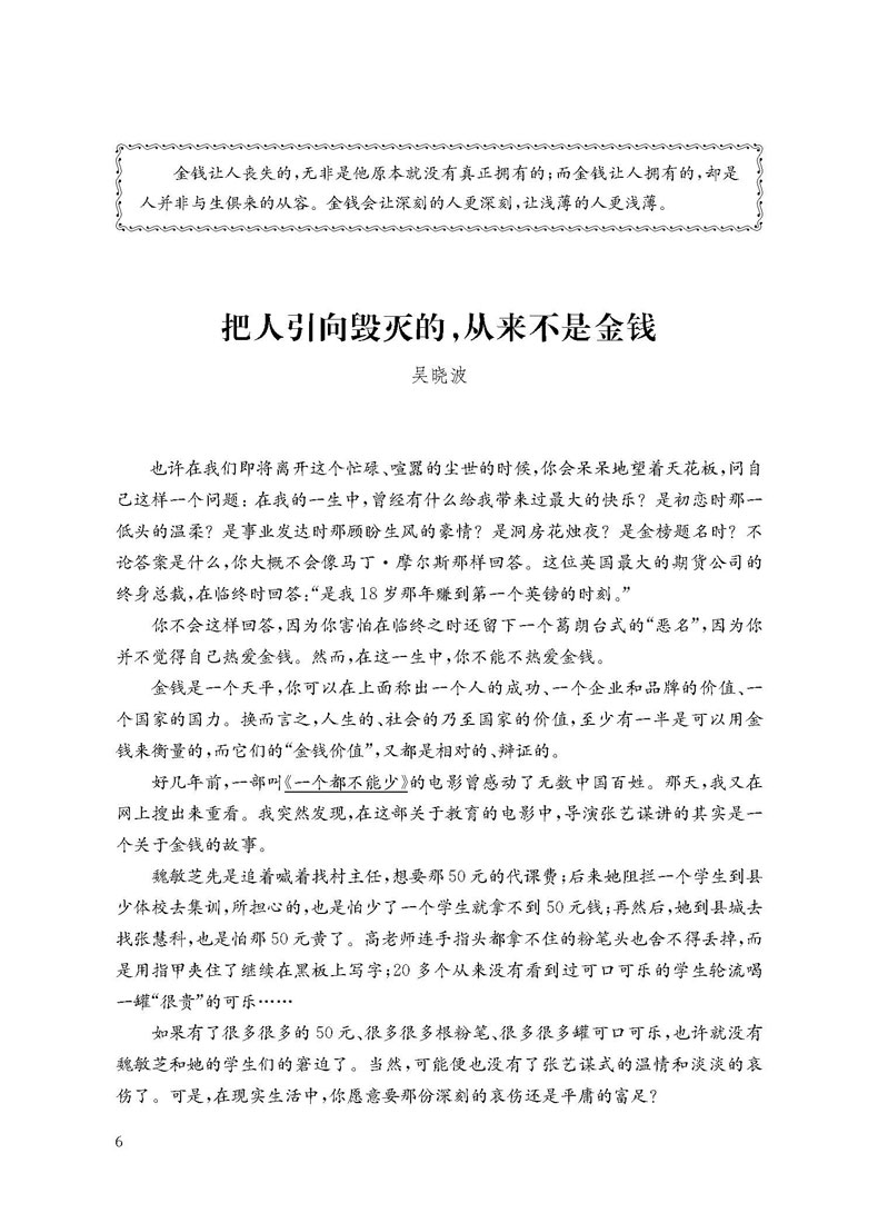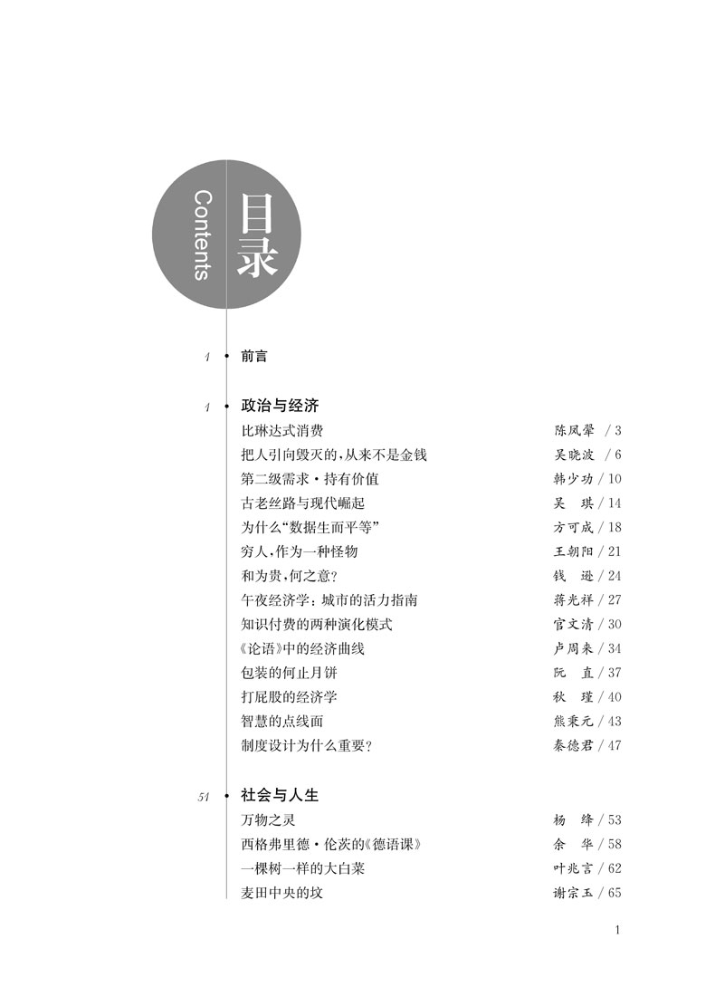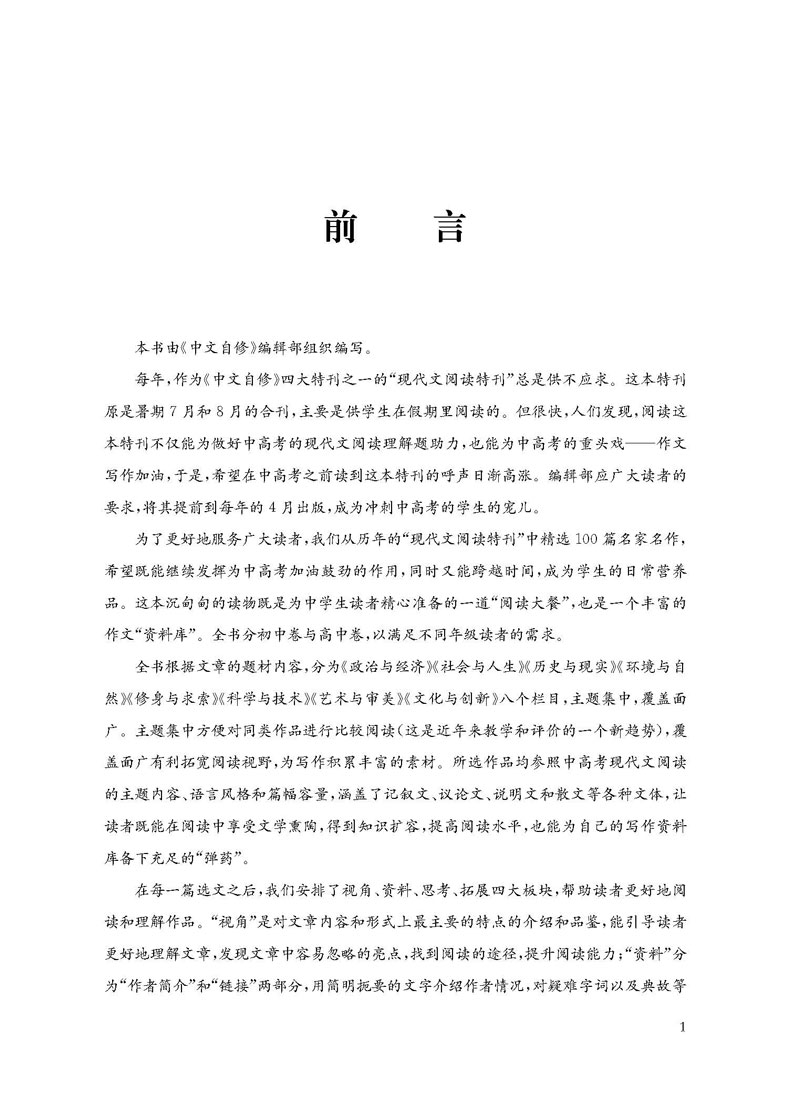 全书根据文章的题材内容,分为《政治与经济》《社会与人生》《历史与现实》《环境与自然》《修身与求索》《科学与技术》《艺术与审美》《文化与创新》八个栏目,主题集中,覆盖面广。主题集中方便对同类作品进行比较阅读,这也是近年来教学和评价的一个新趋势,覆盖面广有利拓宽阅读视野,为写作积累丰富的素材。所选作品均参照中高考现代文阅读的主题内容、语言风格和篇幅容量,涵盖了记叙文、议论文、说明文和散文等各种文体,让读者既能在阅读中享受文学熏陶,得到知识扩容,提高阅读水平,也能为自己的写作资料库备下充足的“弹药”。