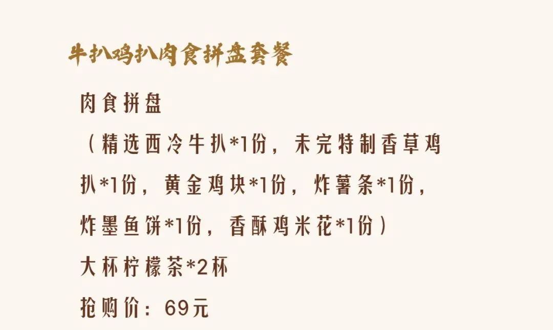 牛扒鸡扒拼盘套餐抢购价:69元/套(门市价168)