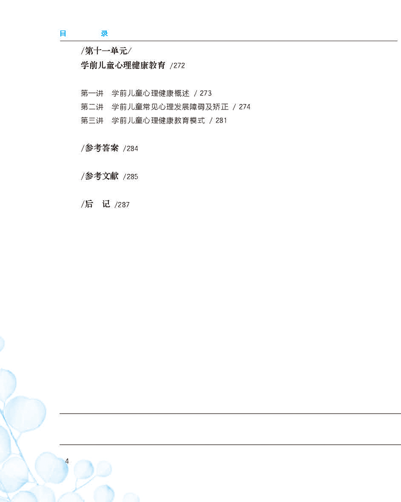 本书是全国职业教育教材审定委员会审定“十二五”职业教育国家规划教材修订版,高职高专学前教育课—岗—证—考一体化新型态立体化系列教材。修订版强化了以学生为中心的教育理念,突出了职业院校学生核心能力的培养。本书体例新颖、逻辑清晰、成果导向、反向设计,有利于学生形成清晰的知识脉络。全书共分11单元,包括学前儿童心理发展概述、学前儿童心理发展理论、学前儿童的注意和感知觉、学前儿童的记忆和想象、学前儿童的思维和言语、学前儿童认知发展的促进、学前儿童情绪情感、学前儿童意志的发展、学前儿童个性的发展、学前儿童社会性的发展和学前儿童心理健康教育。本书可作为高职院校学前教育专业教材,也可供学前教育工作者、幼儿园教师等参考。