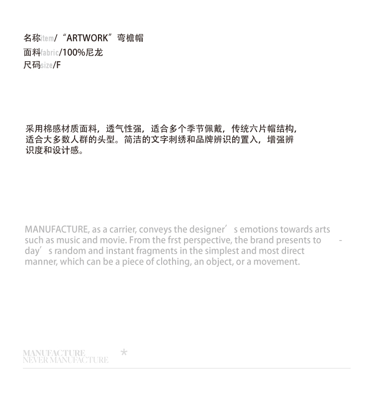 MANUFACTURE BY ATTEMPT ARTWORK 刺绣弯檐帽