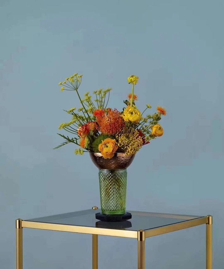 大都会花器-迈阿密尺寸:13.4*13.4*21cm材质:玻璃;外电镀玫瑰金,绿瓶蓝底