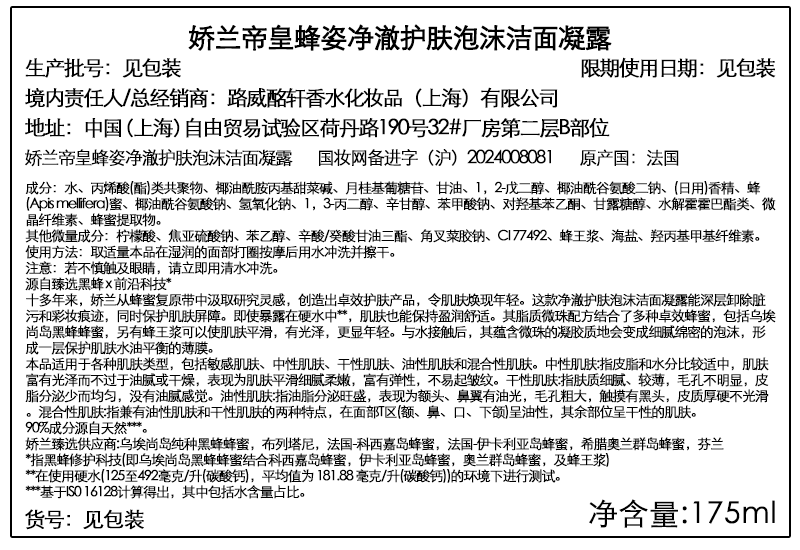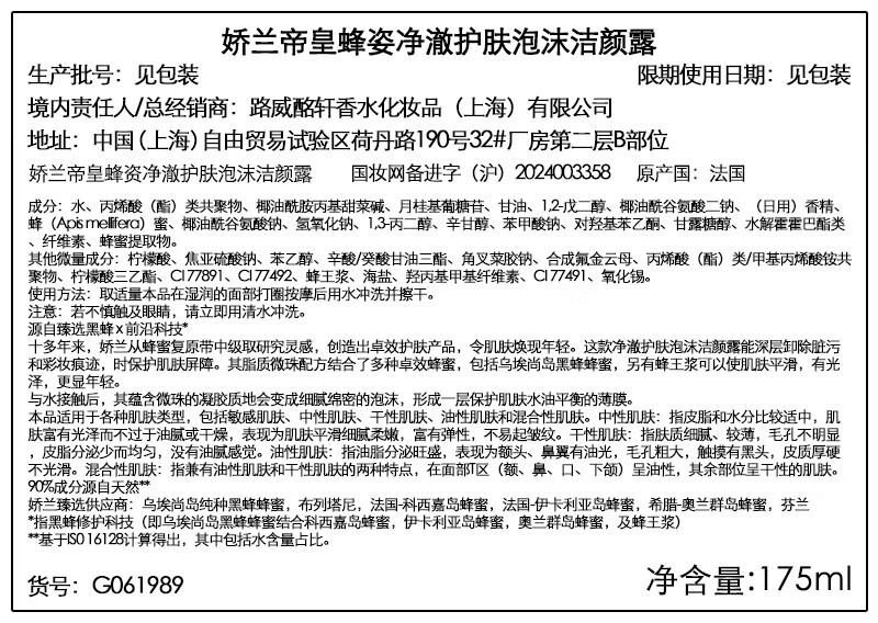 娇兰 帝皇蜂姿净澈洁面凝露175ml 洗面奶清洁卸妆护肤