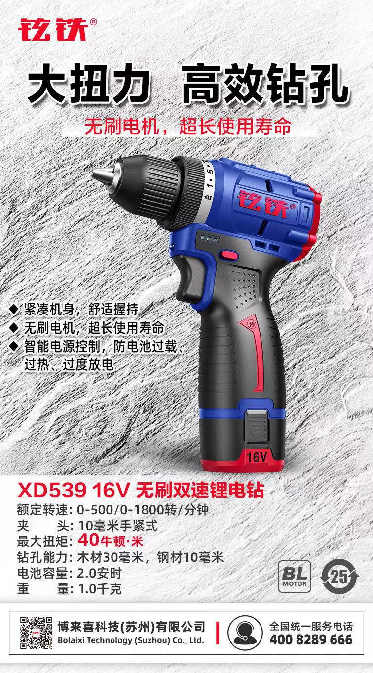 铉铁牌XD539无刷锂电钻/16V/10mm