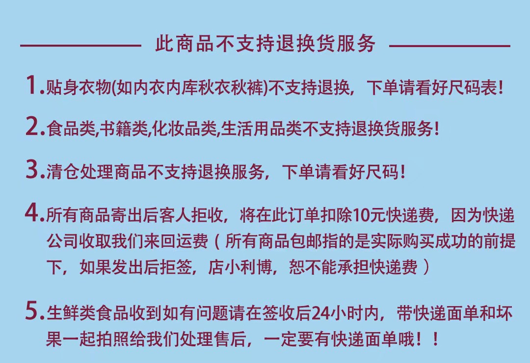 (1)下单后撤单、拦截或改地址收取5元/件费用,不支持拒收,介意慎拍!