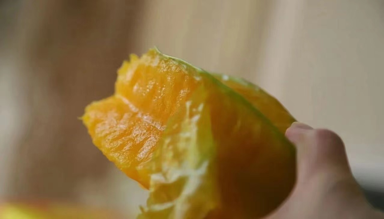 未熟时呈绿色或淡绿色,熟时呈鲜黄色;皮薄如膜、纤维少、果脆汁多、甜酸可口、芳香清甜,可食率92%以上。