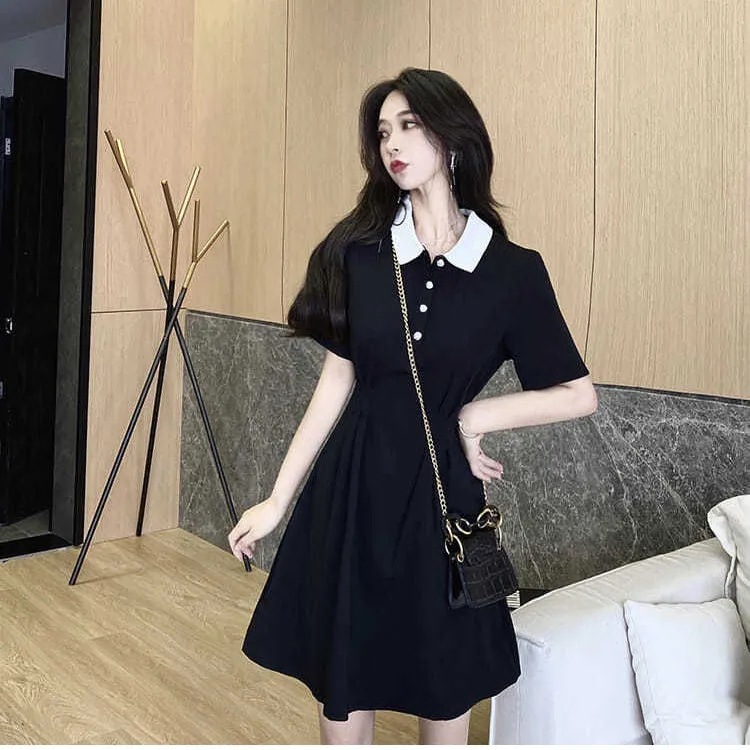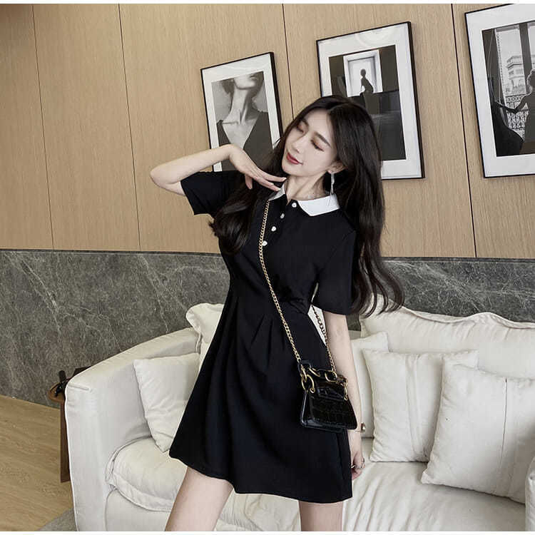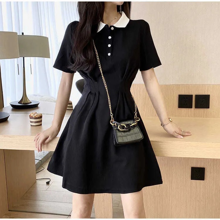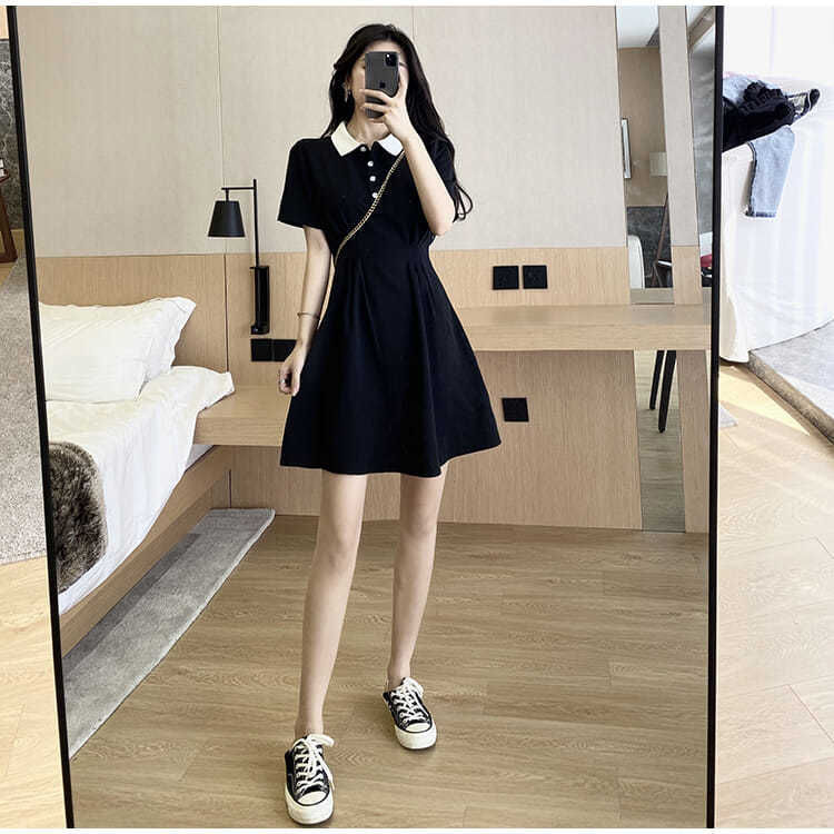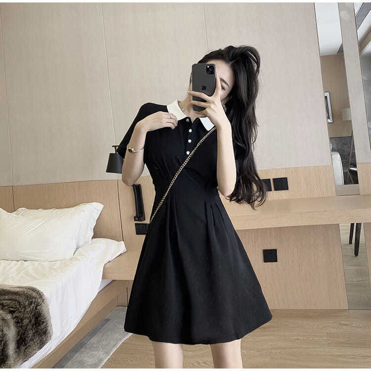 气质连衣裙女2023新款春季学生polo领短袖收腰显瘦学院风小黑裙潮