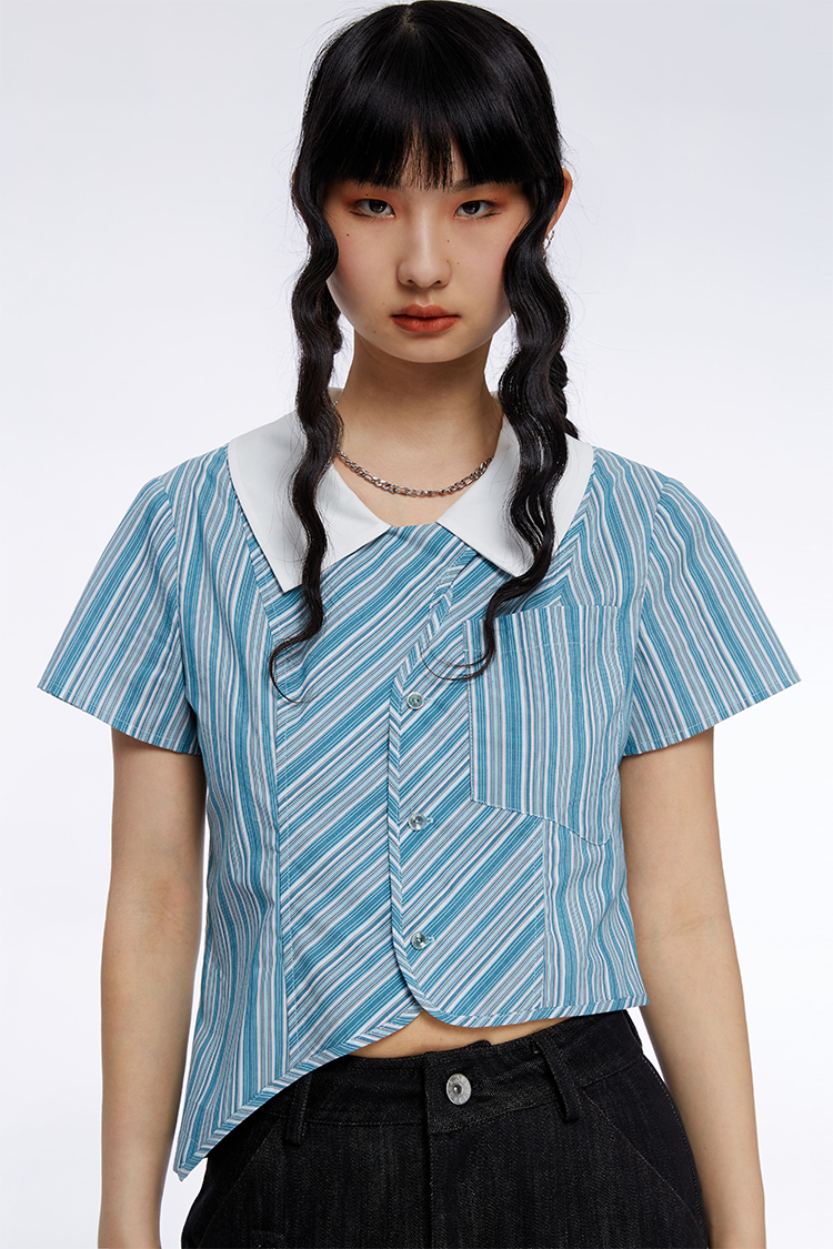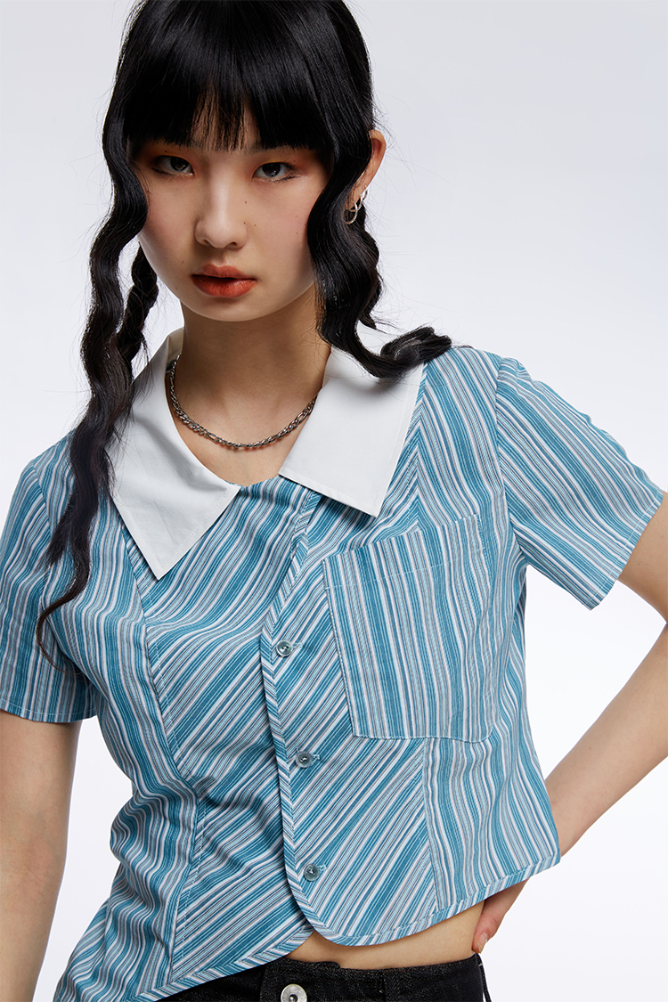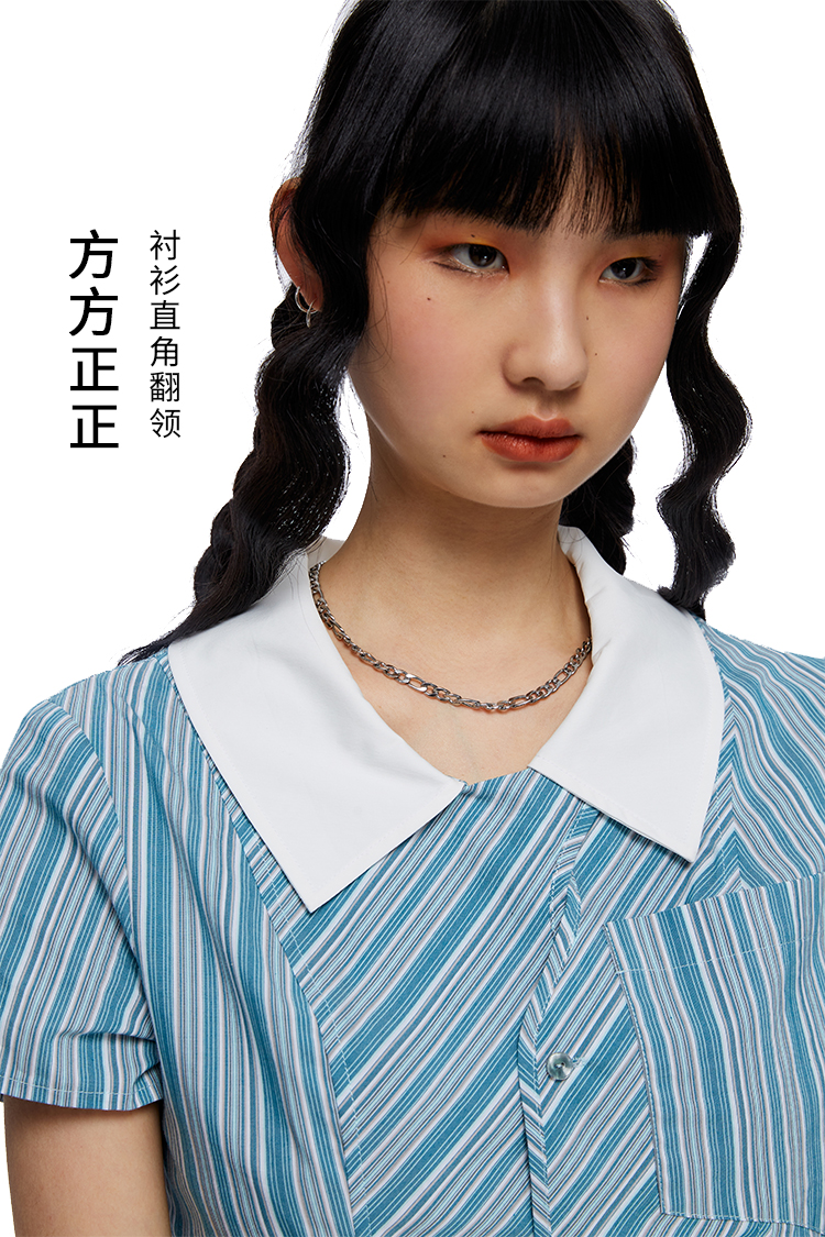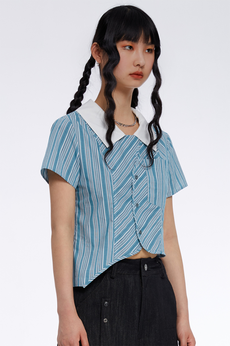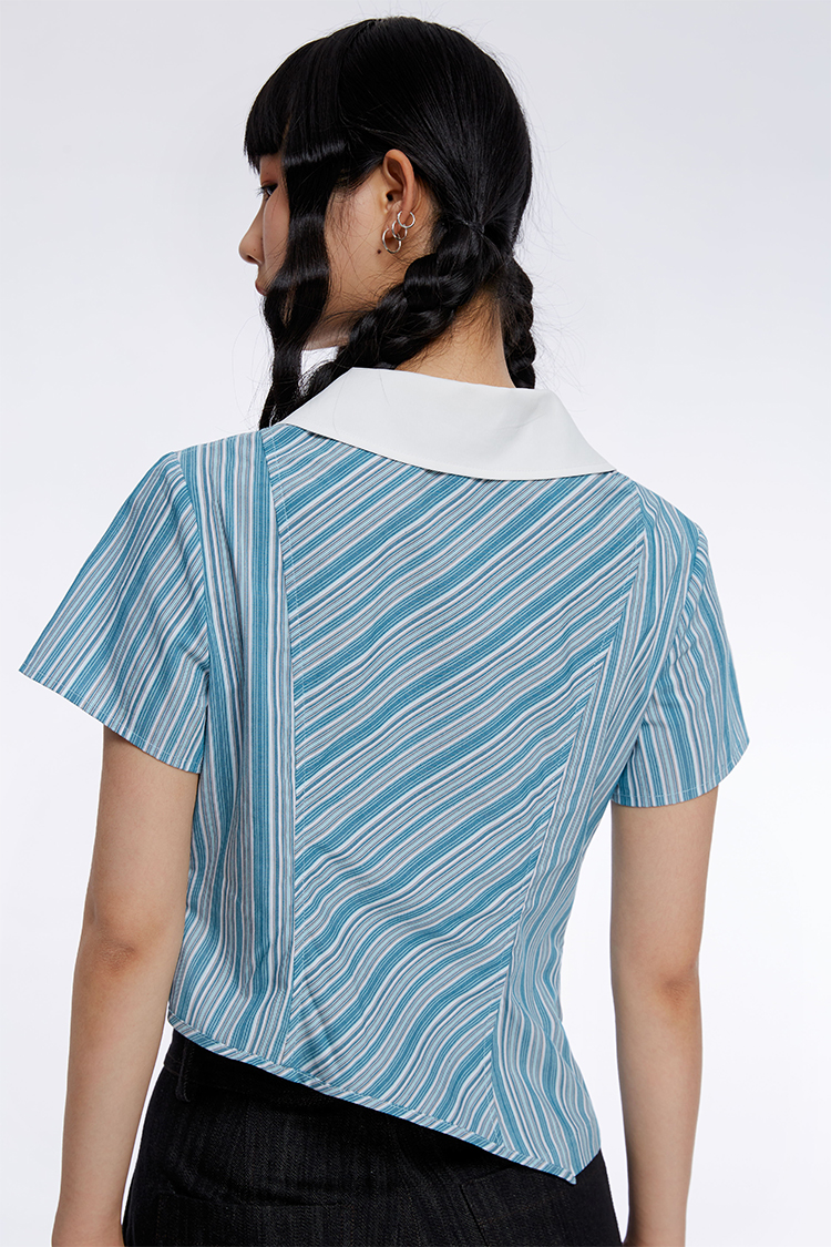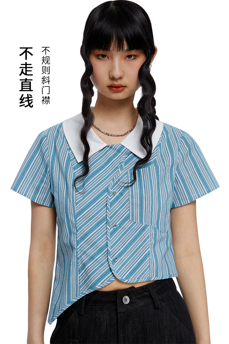 HOLONOMIC 原创不规则短款设计感小众条纹翻领衬衫