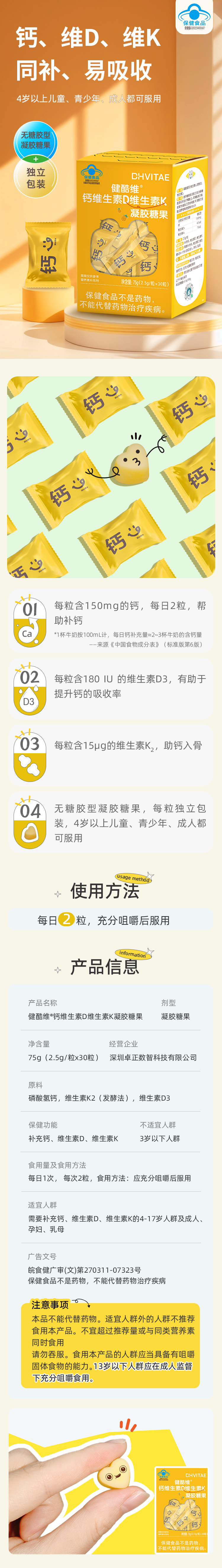 DHVITAE钙维生素D维生素K凝胶糖果2.5g*30粒/盒菠萝口味「严选自研」
