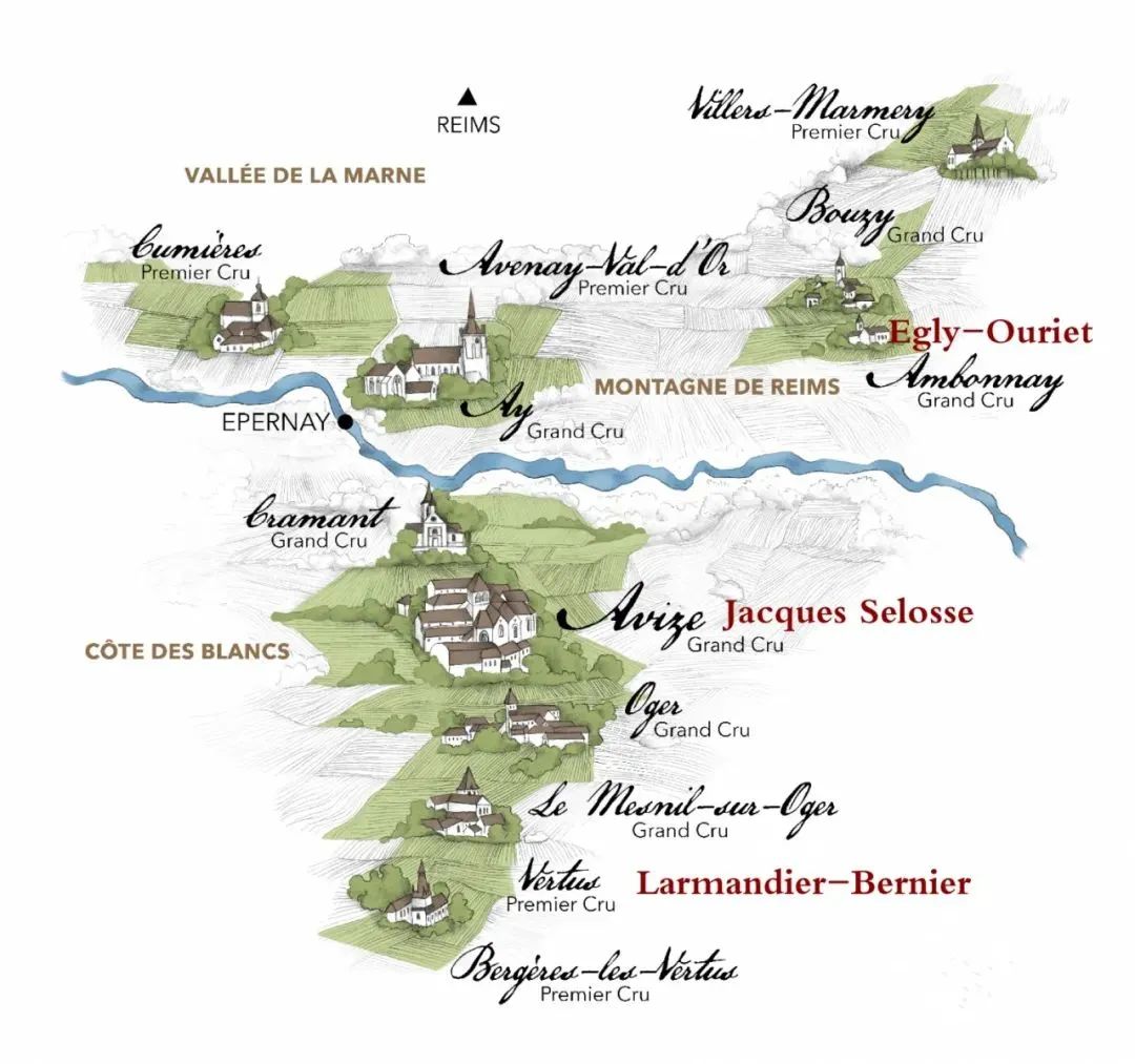 小农香槟三巨头,势均力敌,各有千秋,从地理位置上看,他们如同香槟世界的“南帝北丐中神通”。Larmandier-Bernier和Jacques Selosse主要以霞多丽来酿酒,而Egly-Ouriet的香槟中黑皮诺占据绝对主导。
