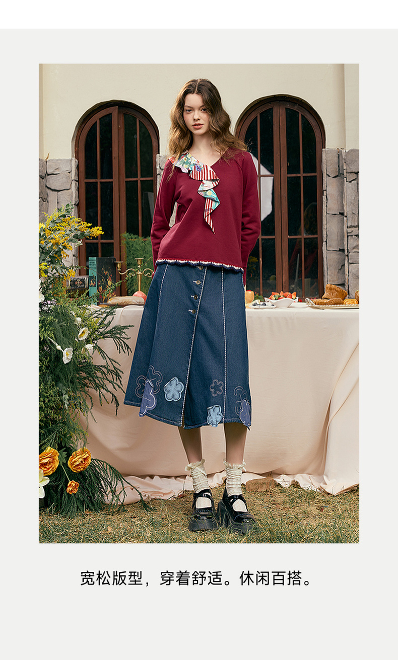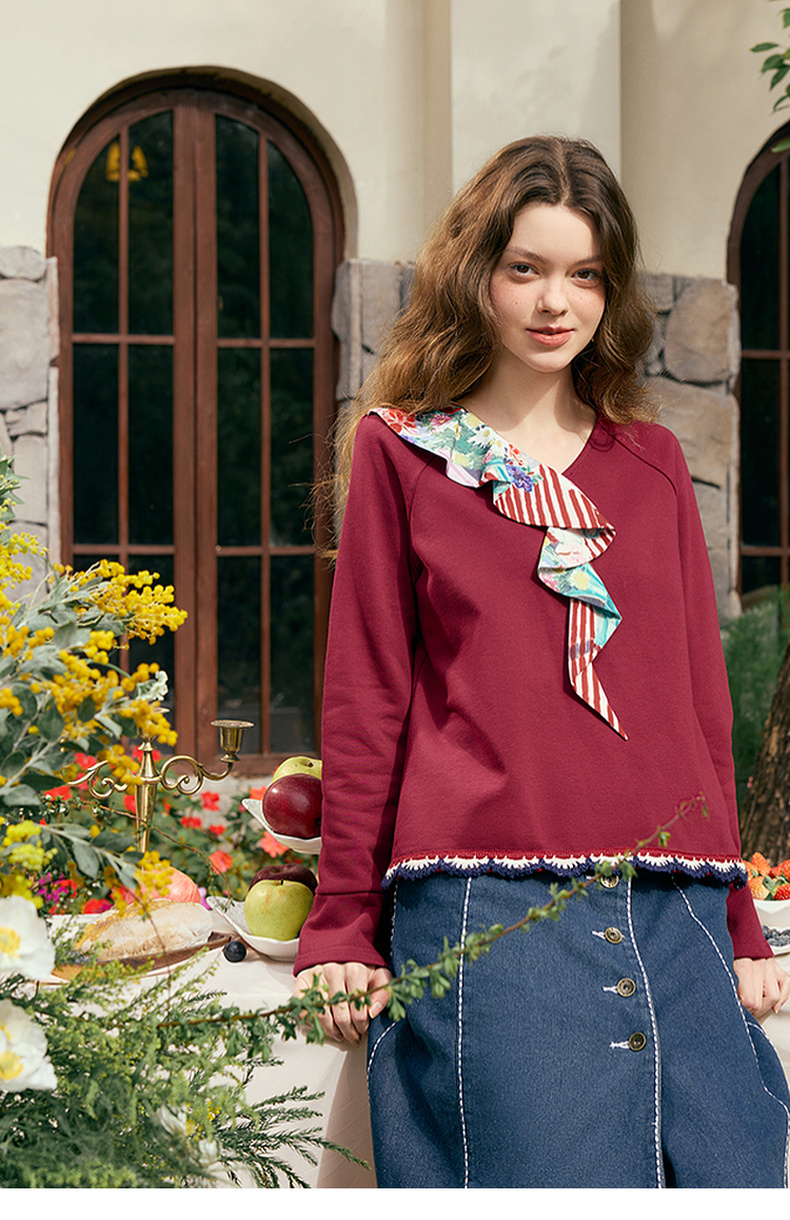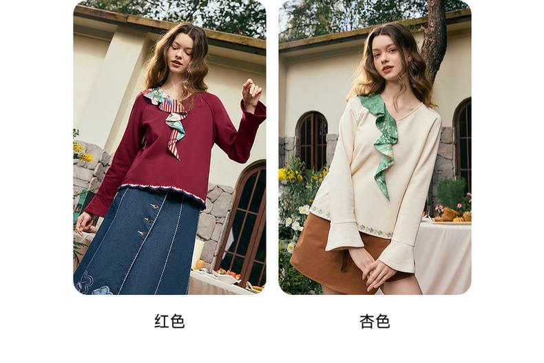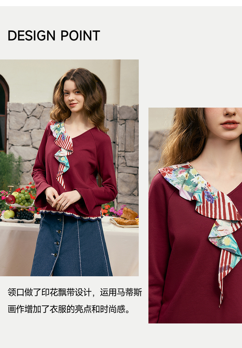 两三事 碧漾春事 2025春季新款小清新印花荷叶边拼接t恤女宽松