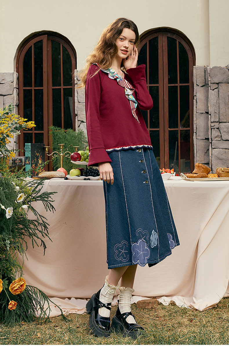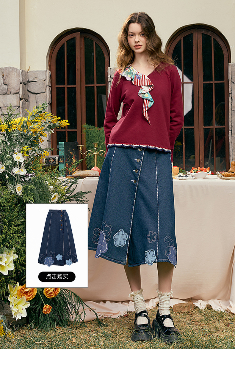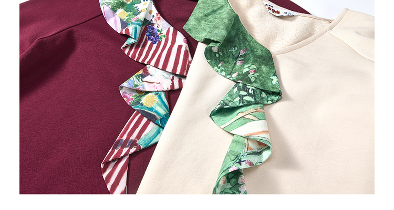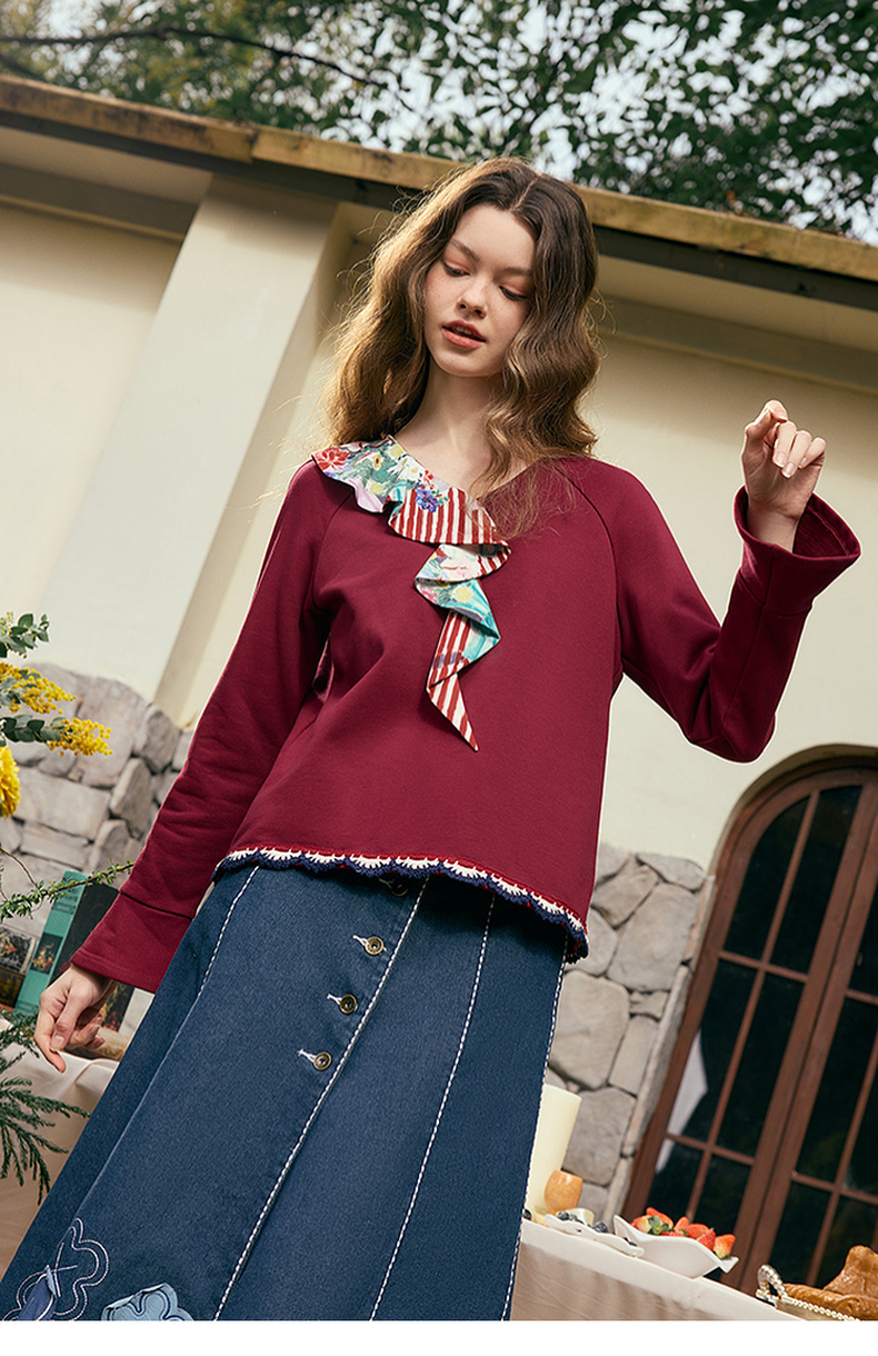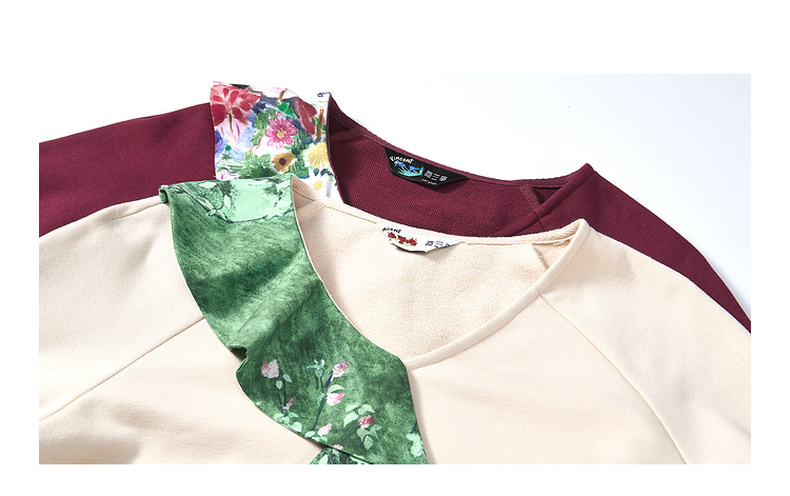 两三事 碧漾春事 2025春季新款小清新印花荷叶边拼接t恤女宽松