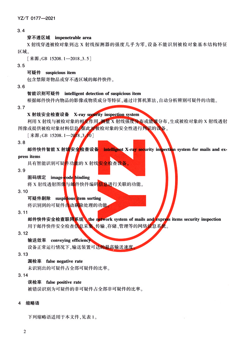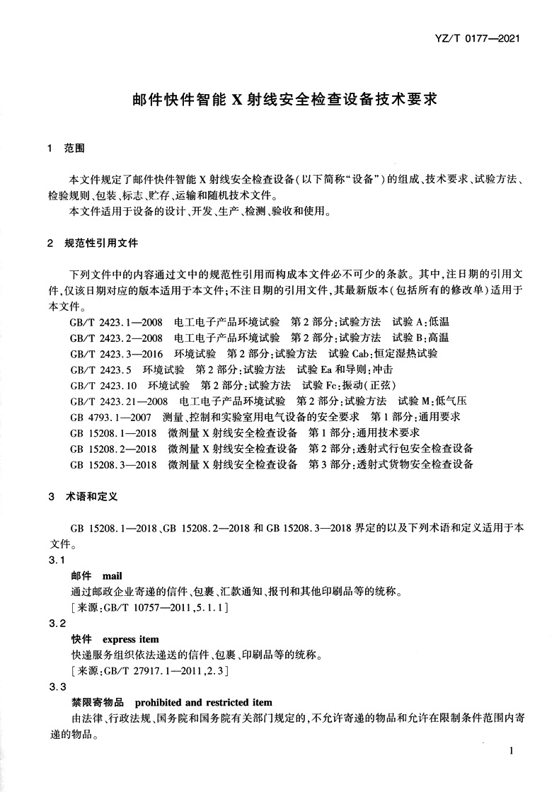 书名:邮件快件智能X射线安全检查设备技术要求(YZ/T 0177—2021)