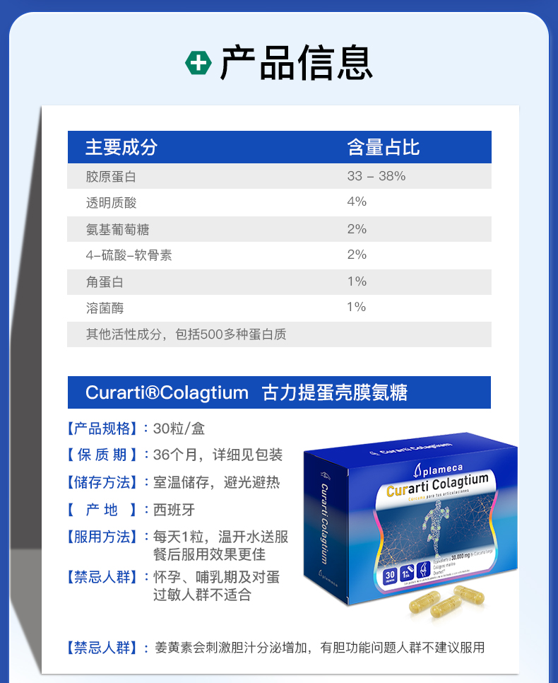 西班牙进口Curarti古力提蛋壳膜氨糖维骨力 30粒/盒