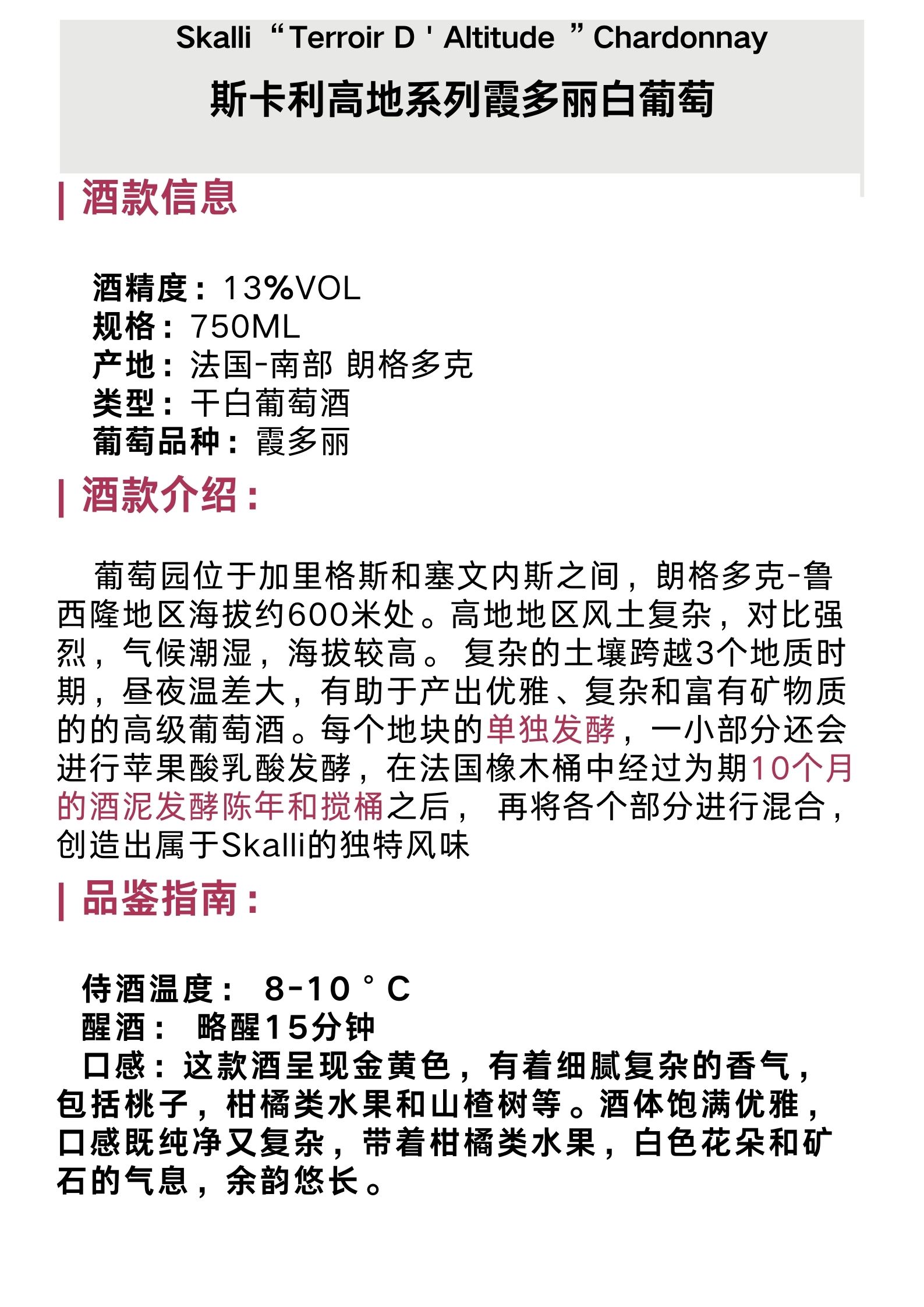 斯卡利高地系列霞多丽白葡萄 Skalli Terroir D'Altitude Chardonnay