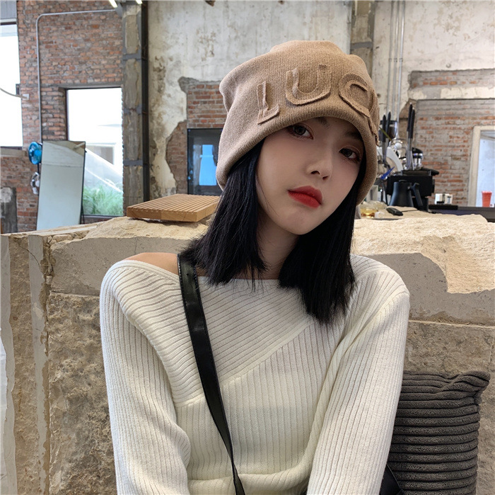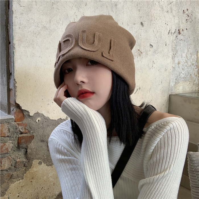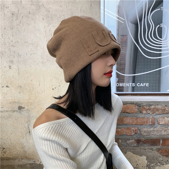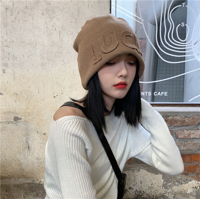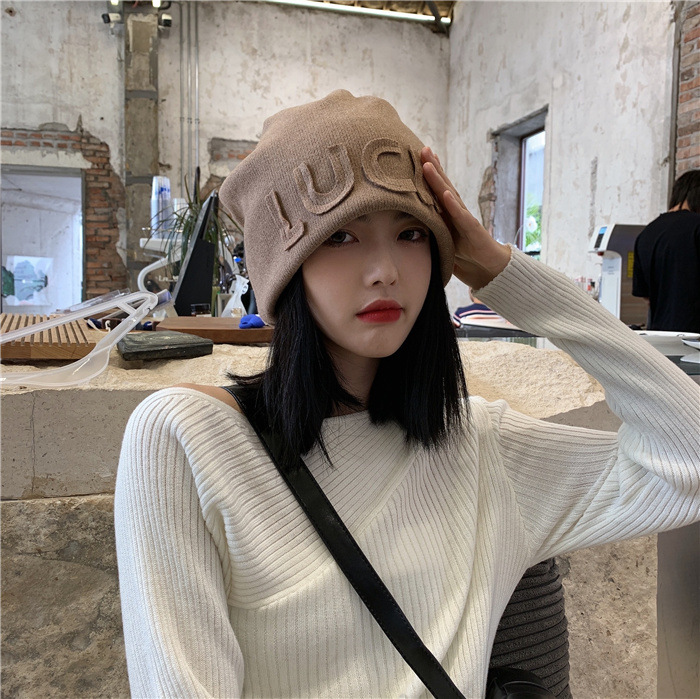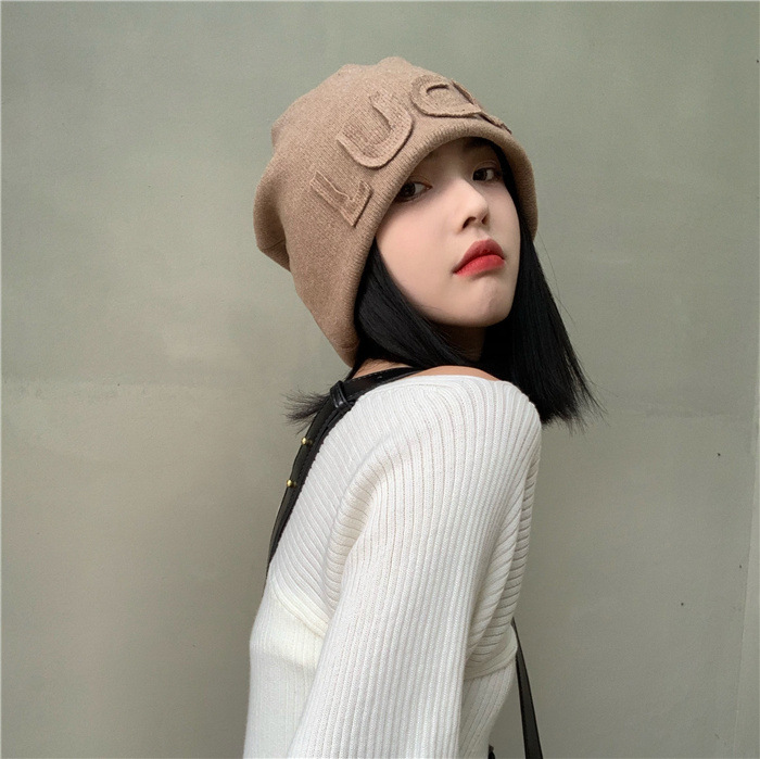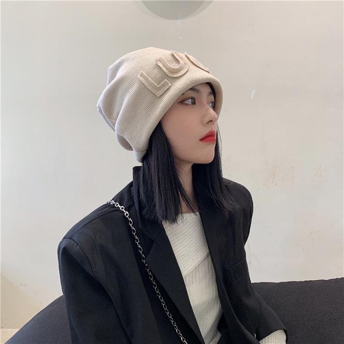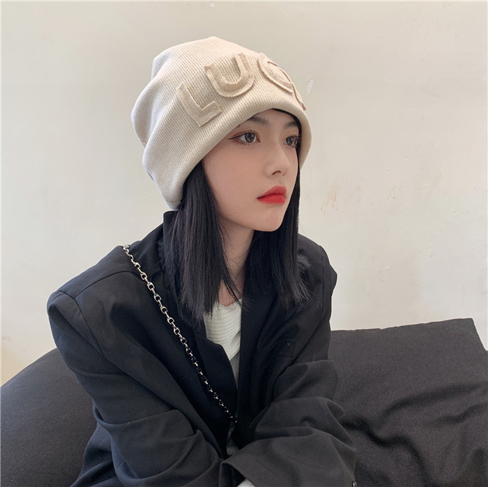 2021新款秋冬新款日系显脸小字母冷帽子女网红护耳包头帽大头围复古针织帽
