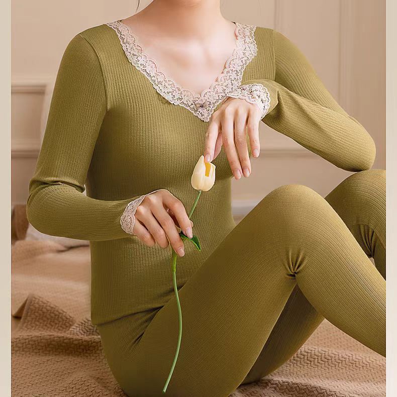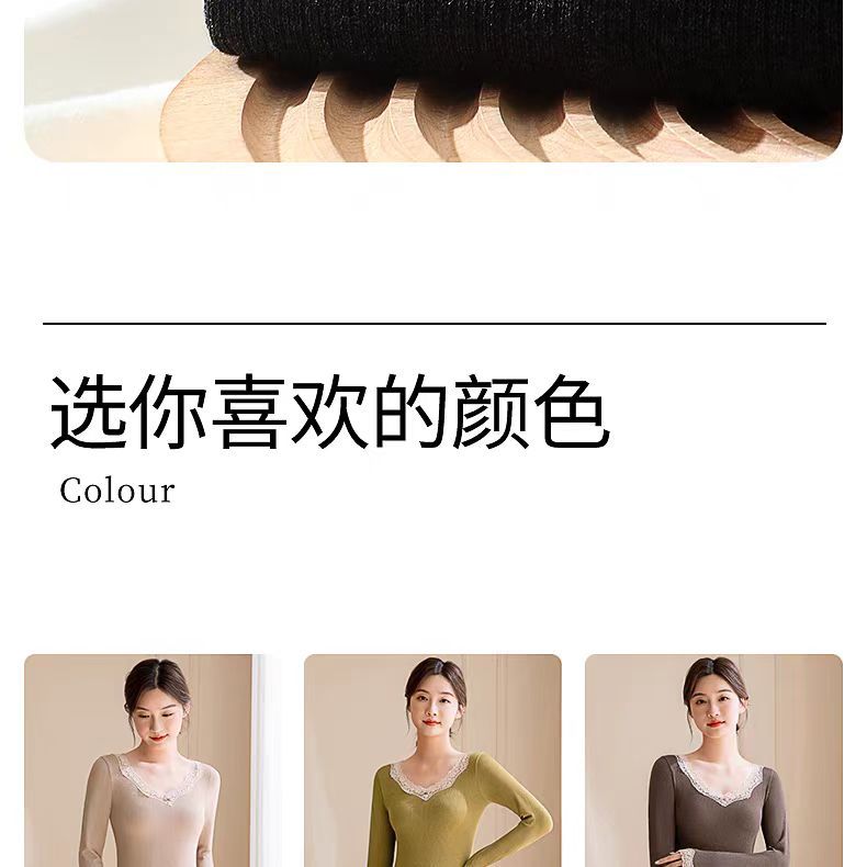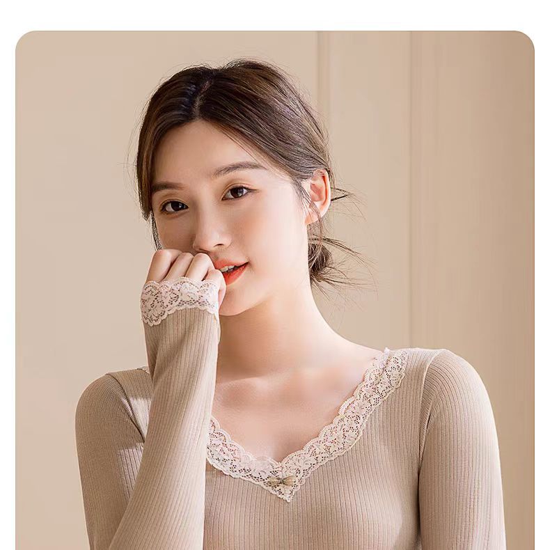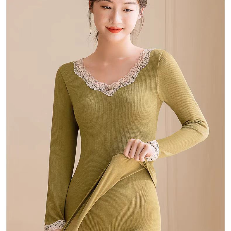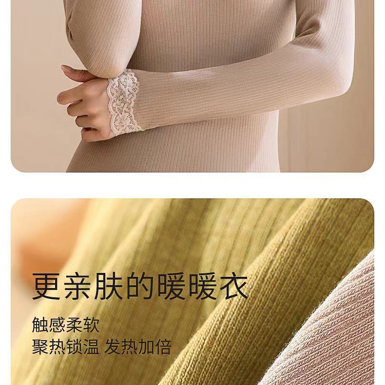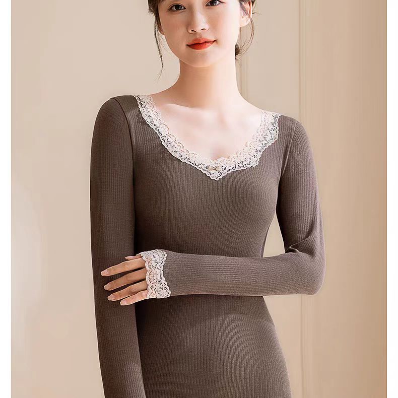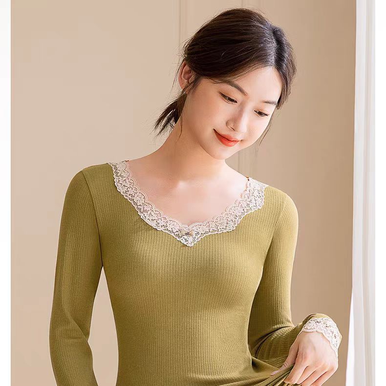 绵羊毛保暖内衣套装 腈纶蕾丝花边领秋衣秋裤女 可外穿保暖衣发热衣