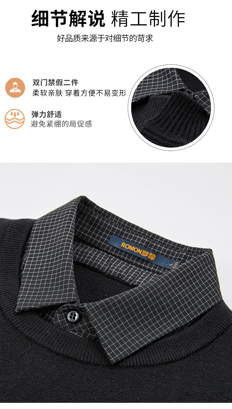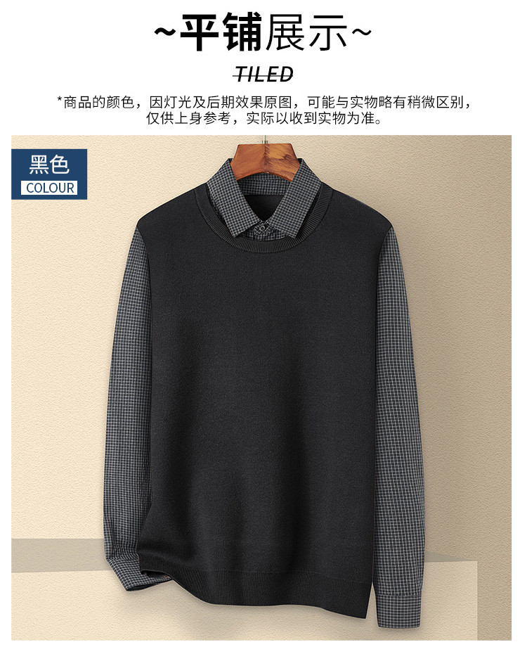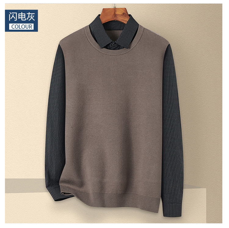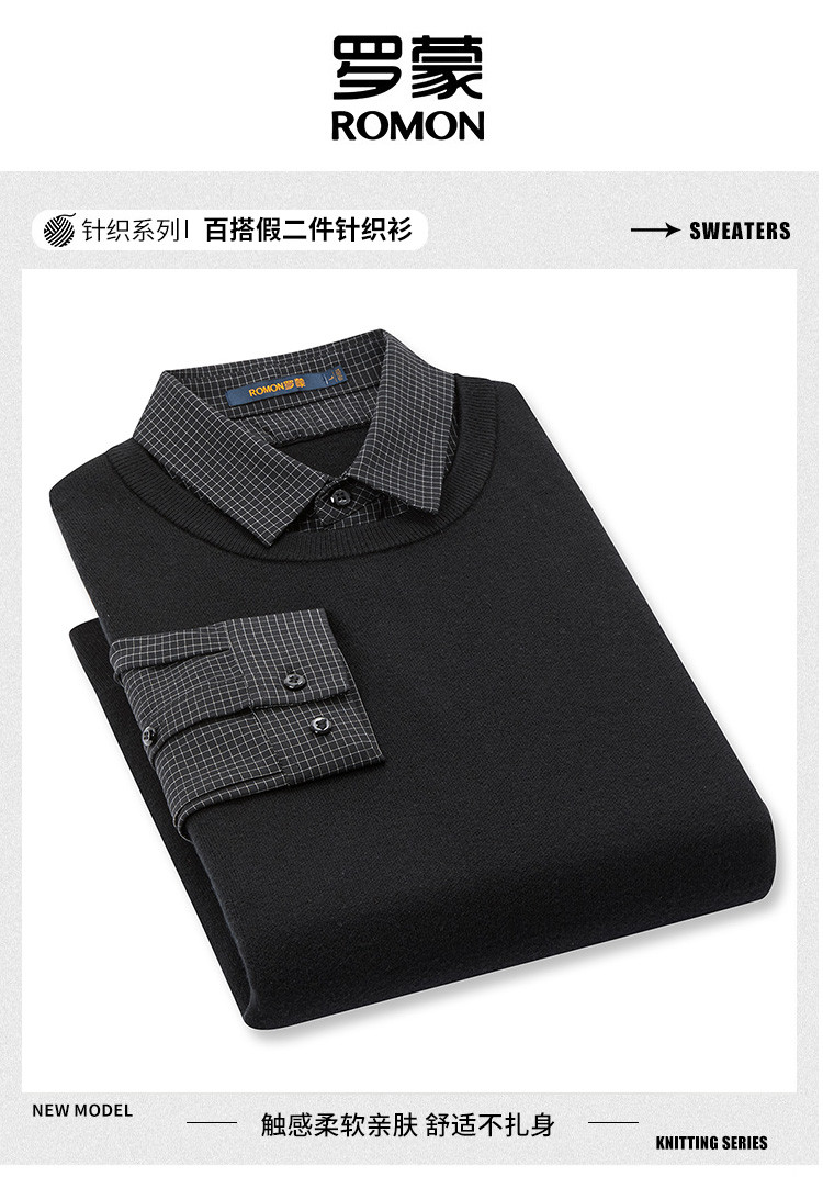 罗蒙男士秋冬复古假两件针织衫男毛衣时尚通勤休闲百搭男衬衫