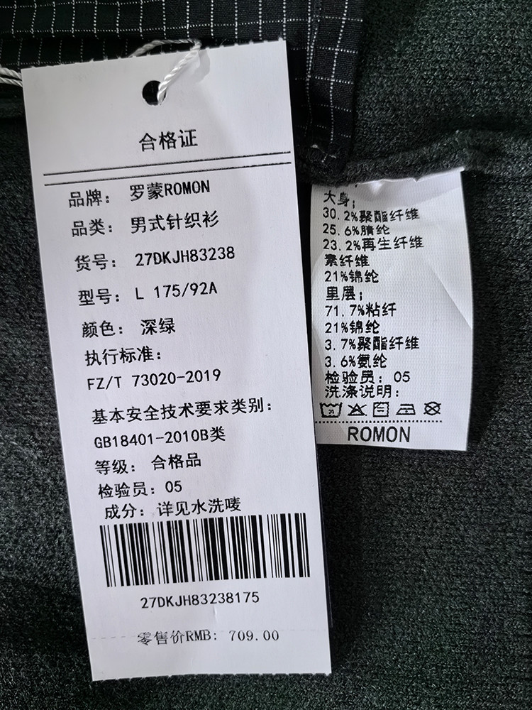 大身:30.2%聚酯纤维 25.6%腈纶 23.2%再生纤维素纤维 21%锦纶 里层:71.7%粘纤 21%锦纶 3.7%聚酯纤维 3.6%氨纶