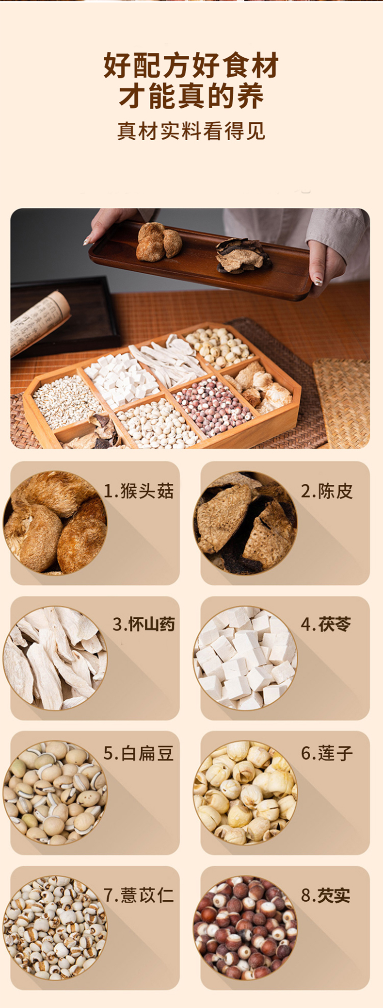 芡实、茯苓、陈皮、配猴头菇粉(>5g)