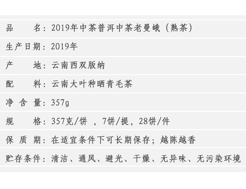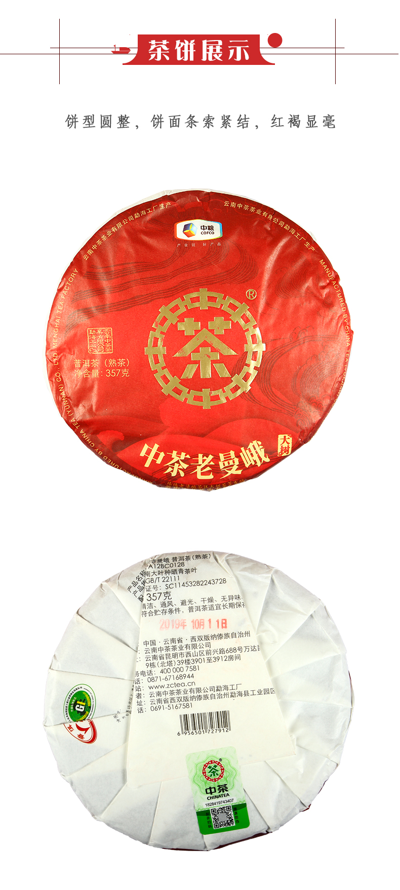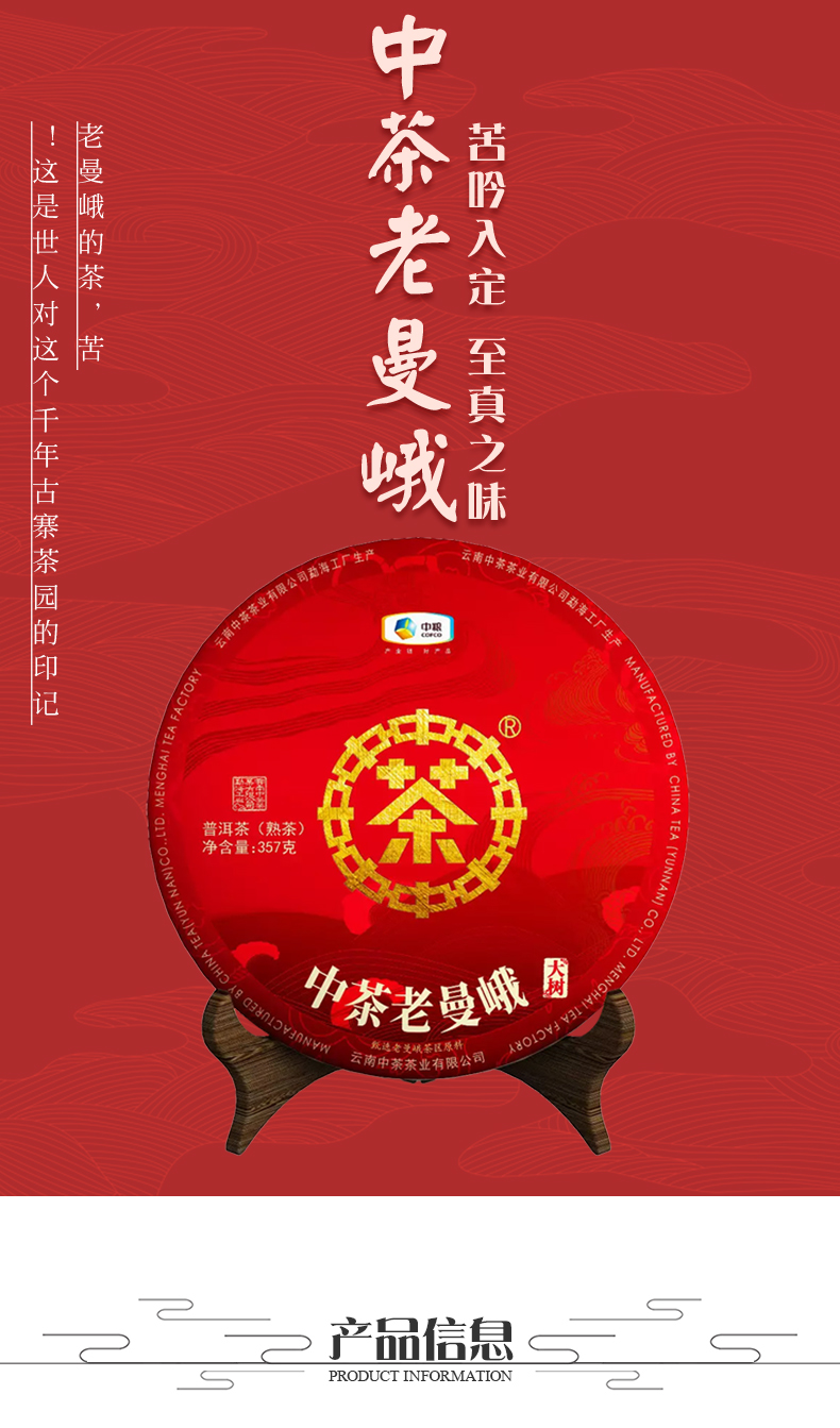 中粮-中茶 2019年老曼峨大树云南普洱茶熟茶饼 357g/饼 /云南干仓直发