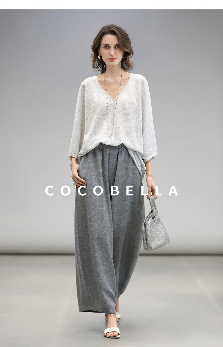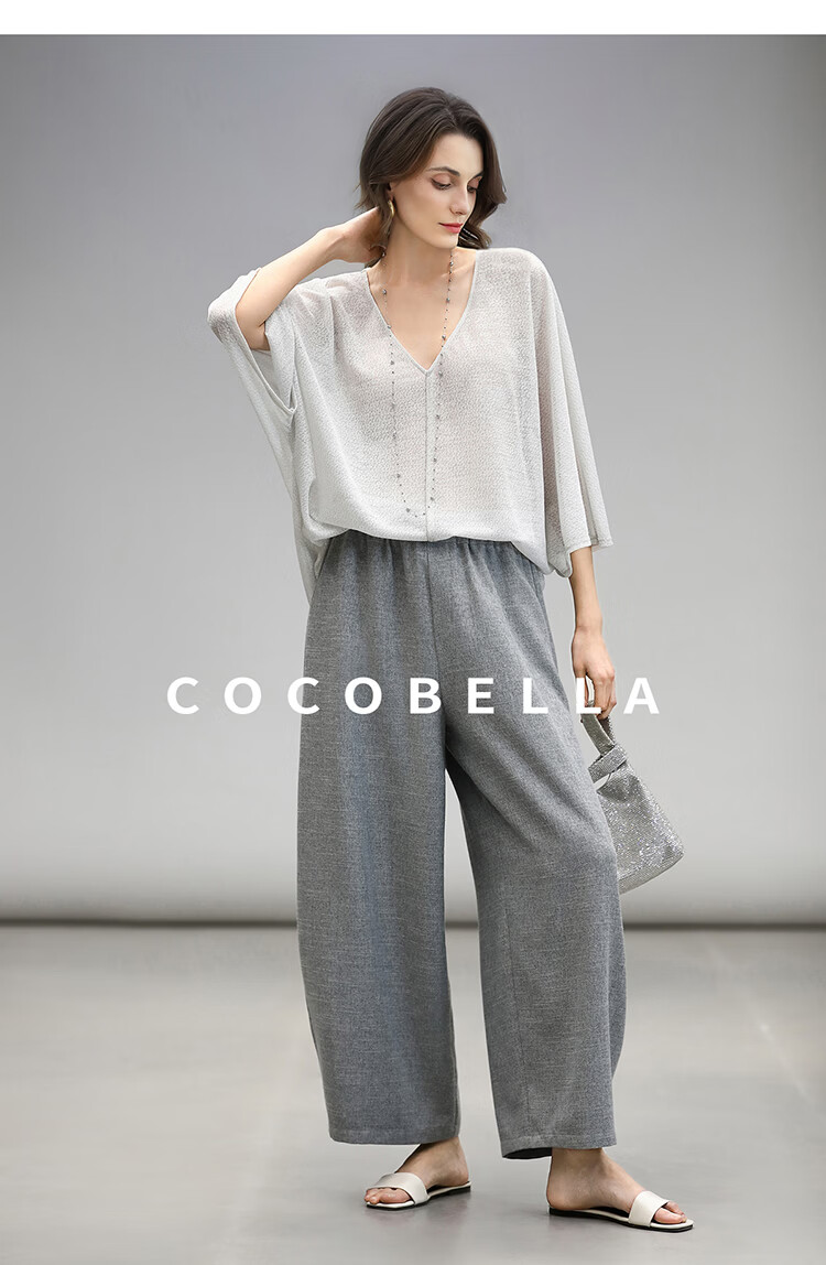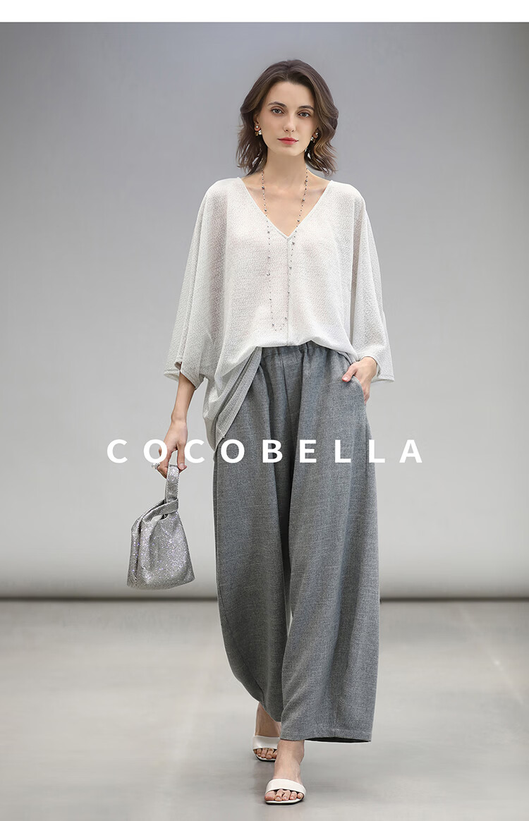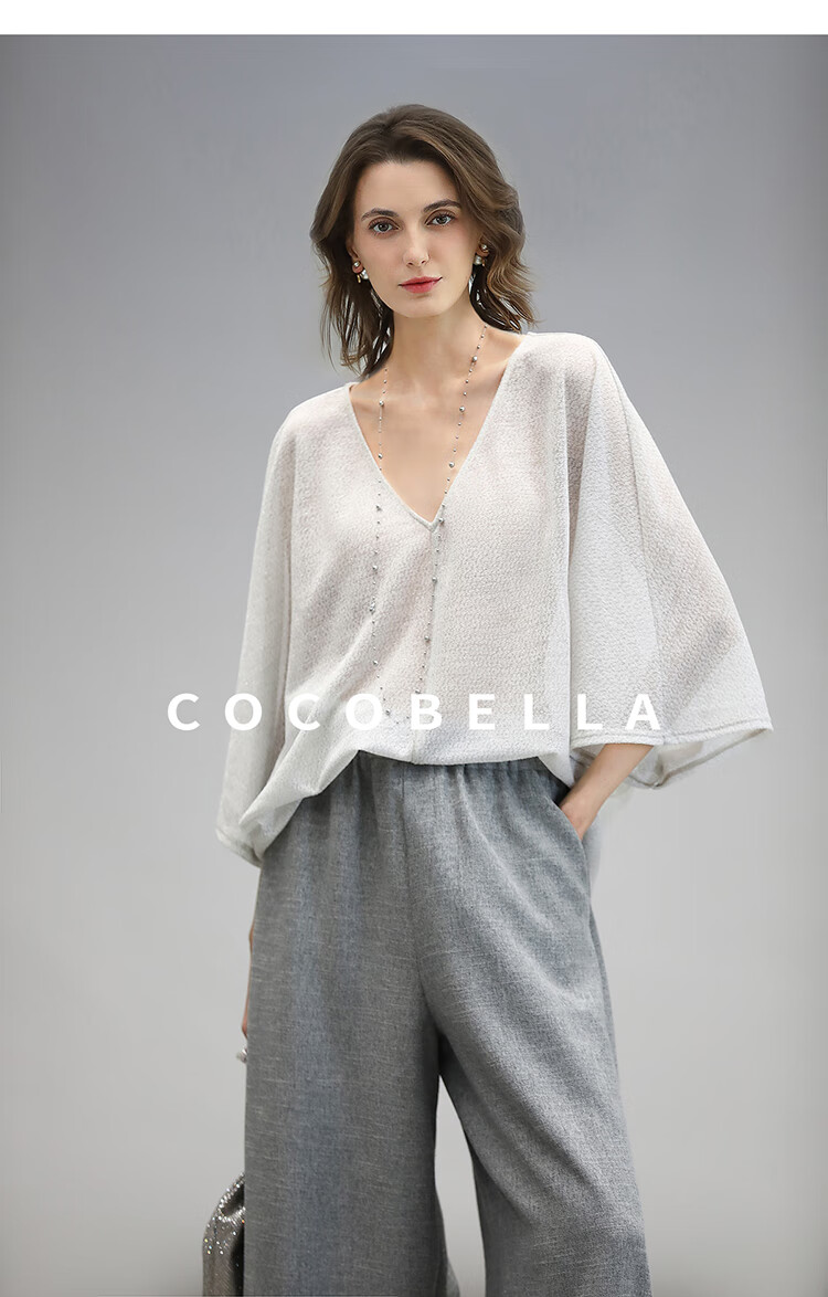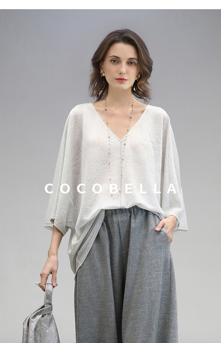 COCOBELLA细闪银葱针织衫女夏宽松遮阳T恤慵懒风V领罩衫TS3196