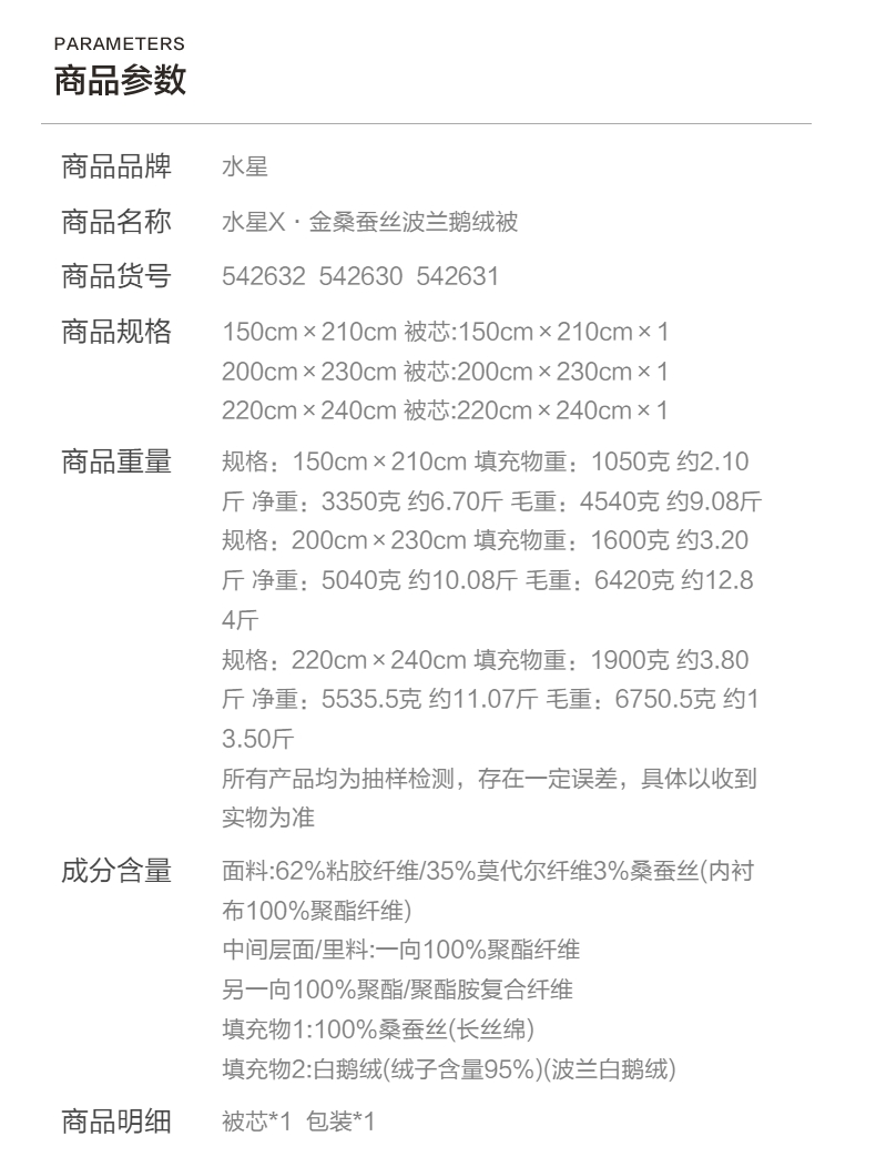 水星家纺MERCURY 【限定·品牌直发】床上用品水星X·金桑蚕丝波兰鹅绒被2489420