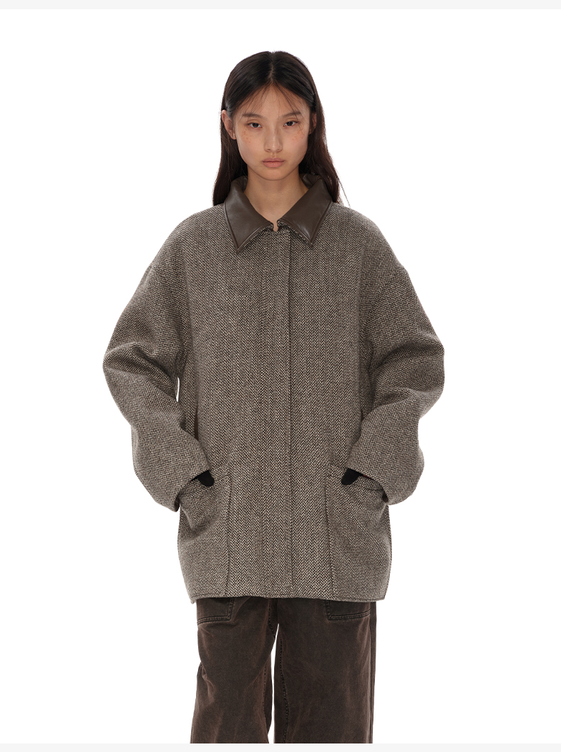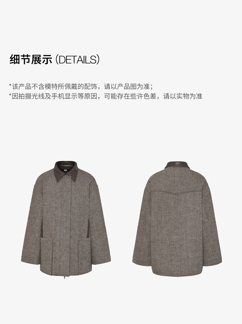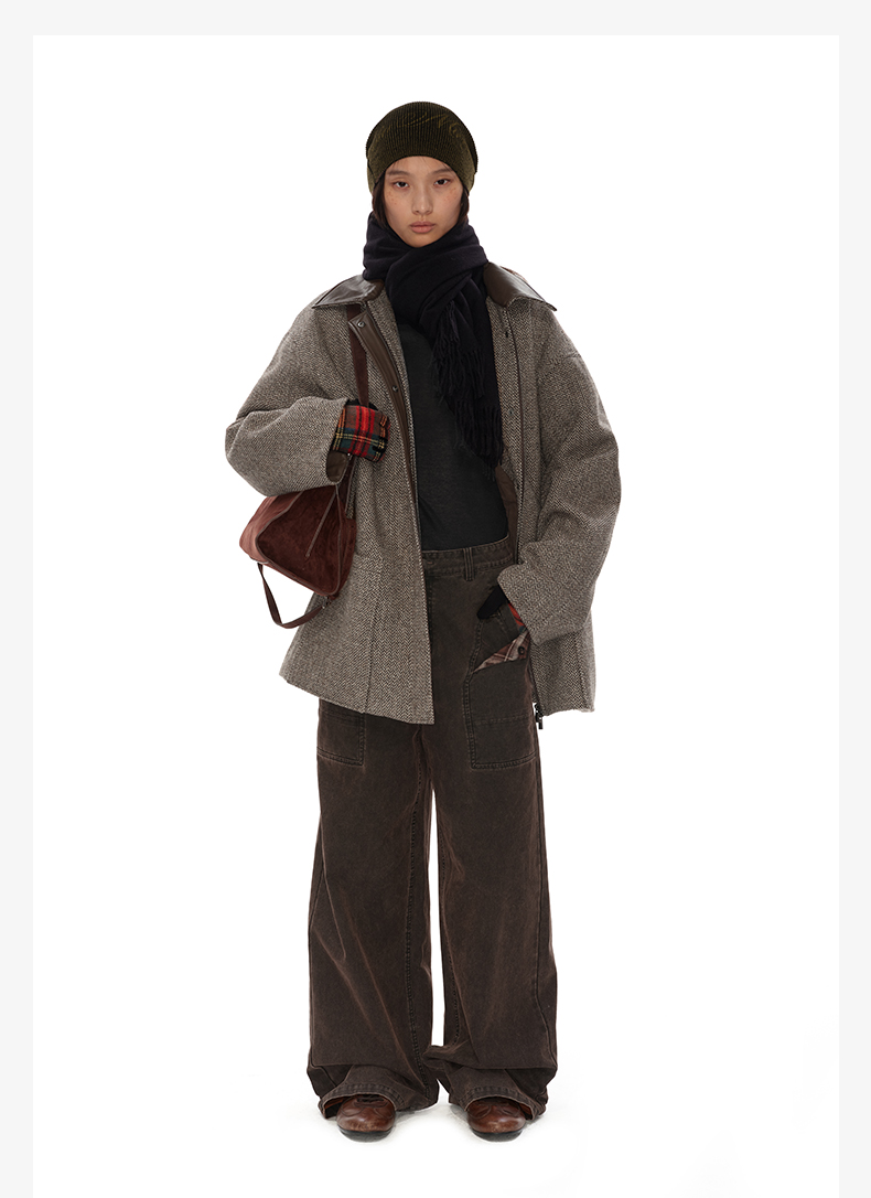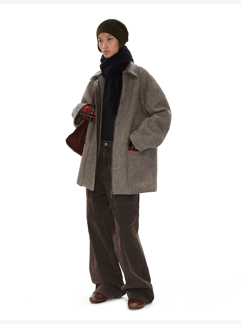 NUTH 复古宽松中长款毛呢夹克外套女拼皮保暖夹棉服女秋冬