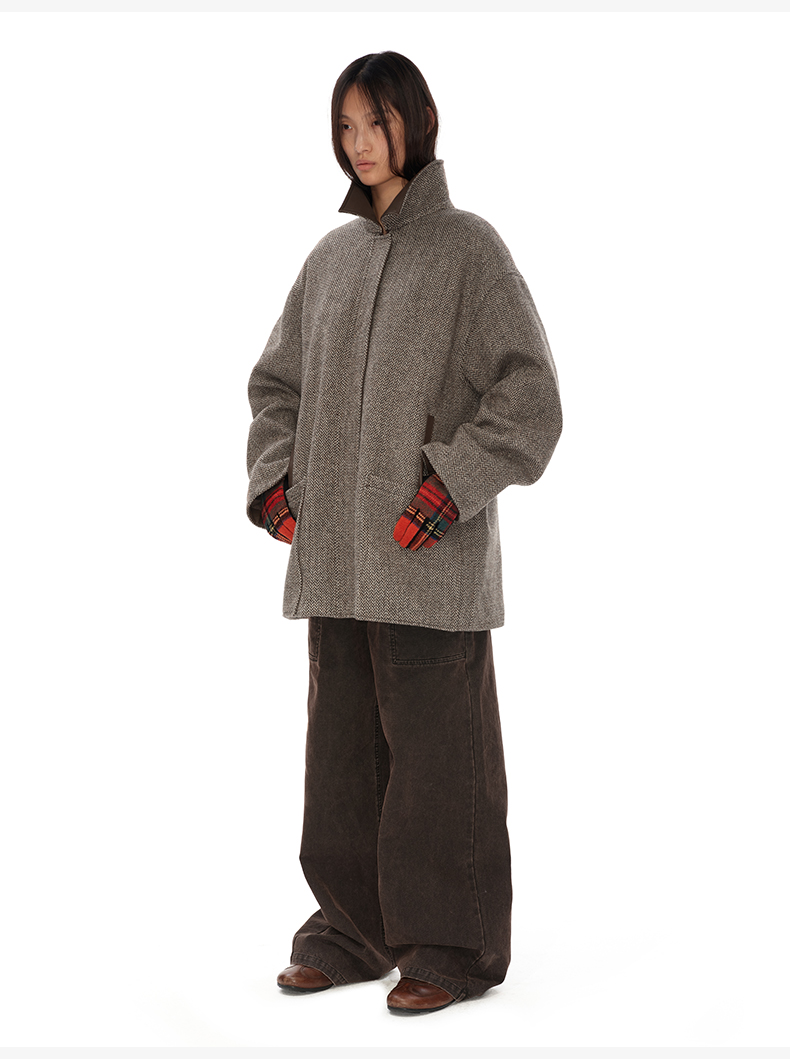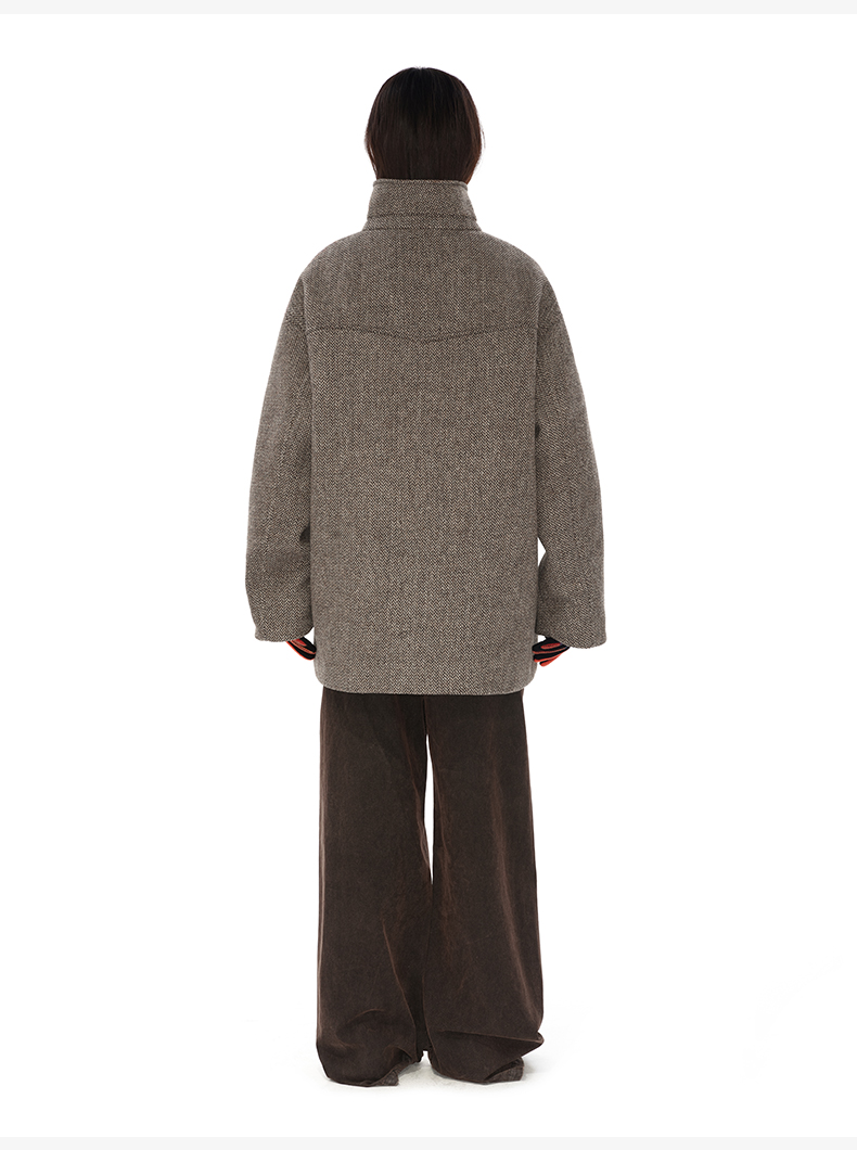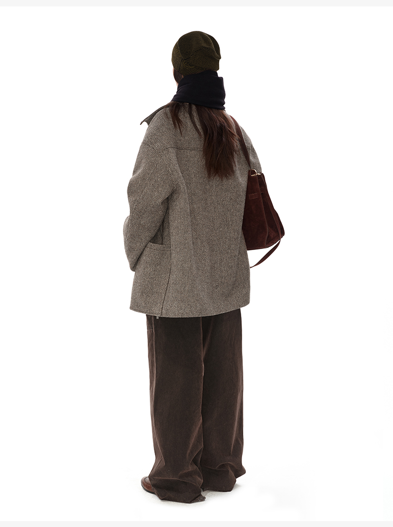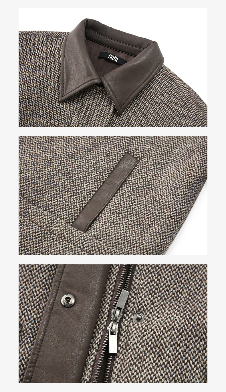 NUTH 复古宽松中长款毛呢夹克外套女拼皮保暖夹棉服女秋冬