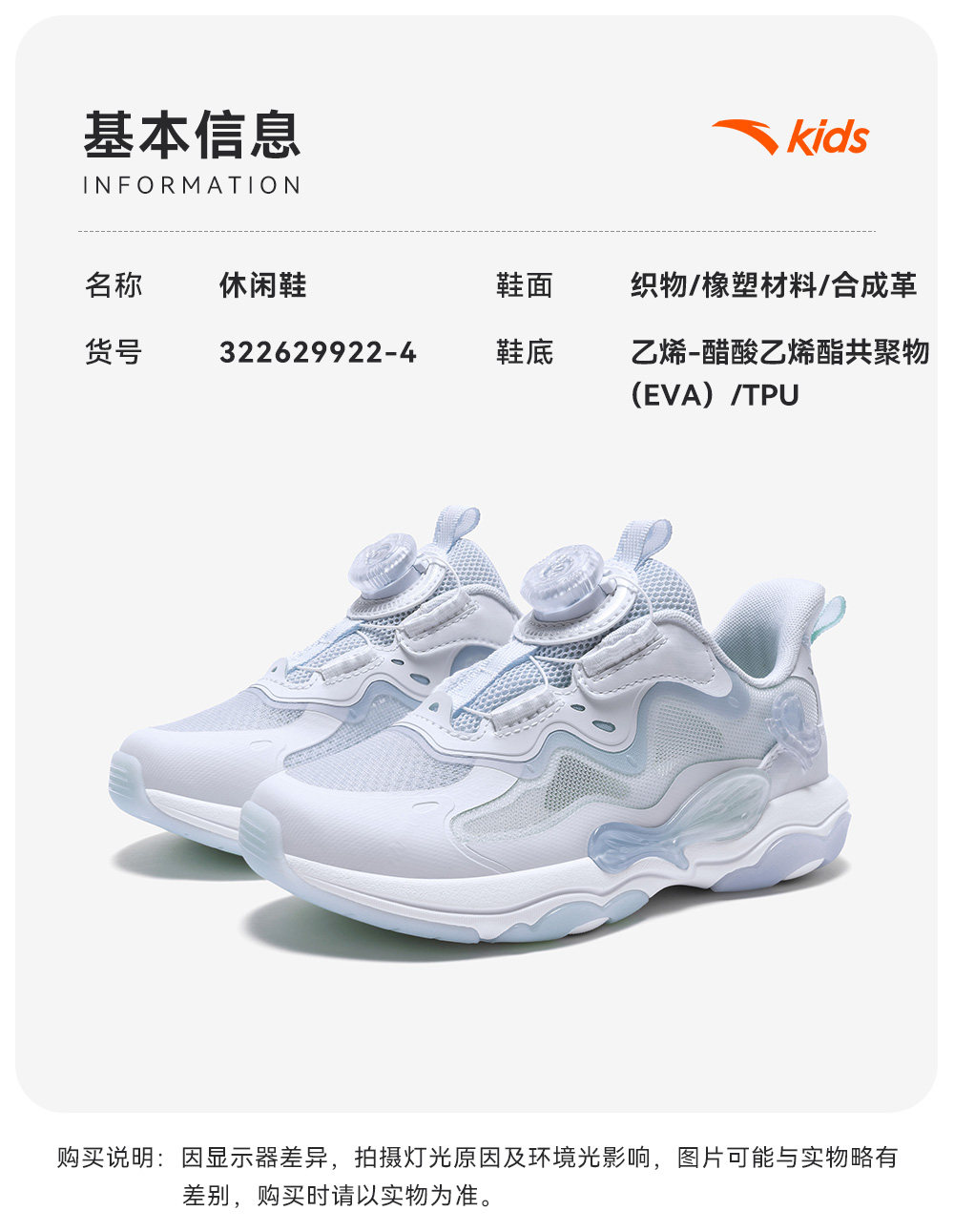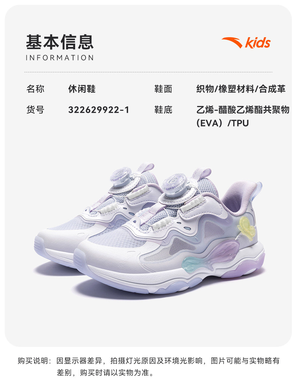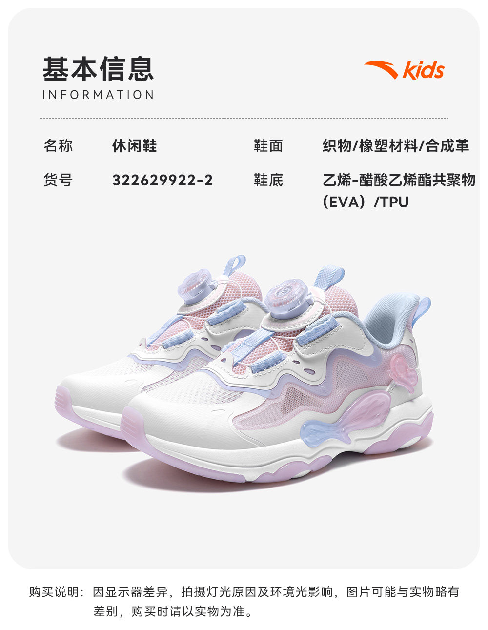 蝶翼6代丨安踏儿童运动鞋女童鞋26年新款犟旋钮网面小童鞋休闲鞋322629922