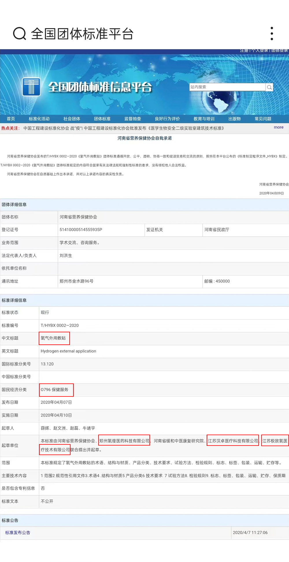 “全国团体标准信息平台”是国家标准化管理委员会所属官方权威平台,平台上保健资质的“氢气外用敷贴”,民用品名称是“汉卓氢乳贴”。