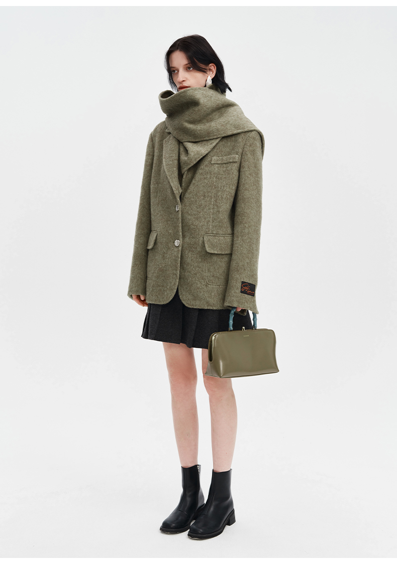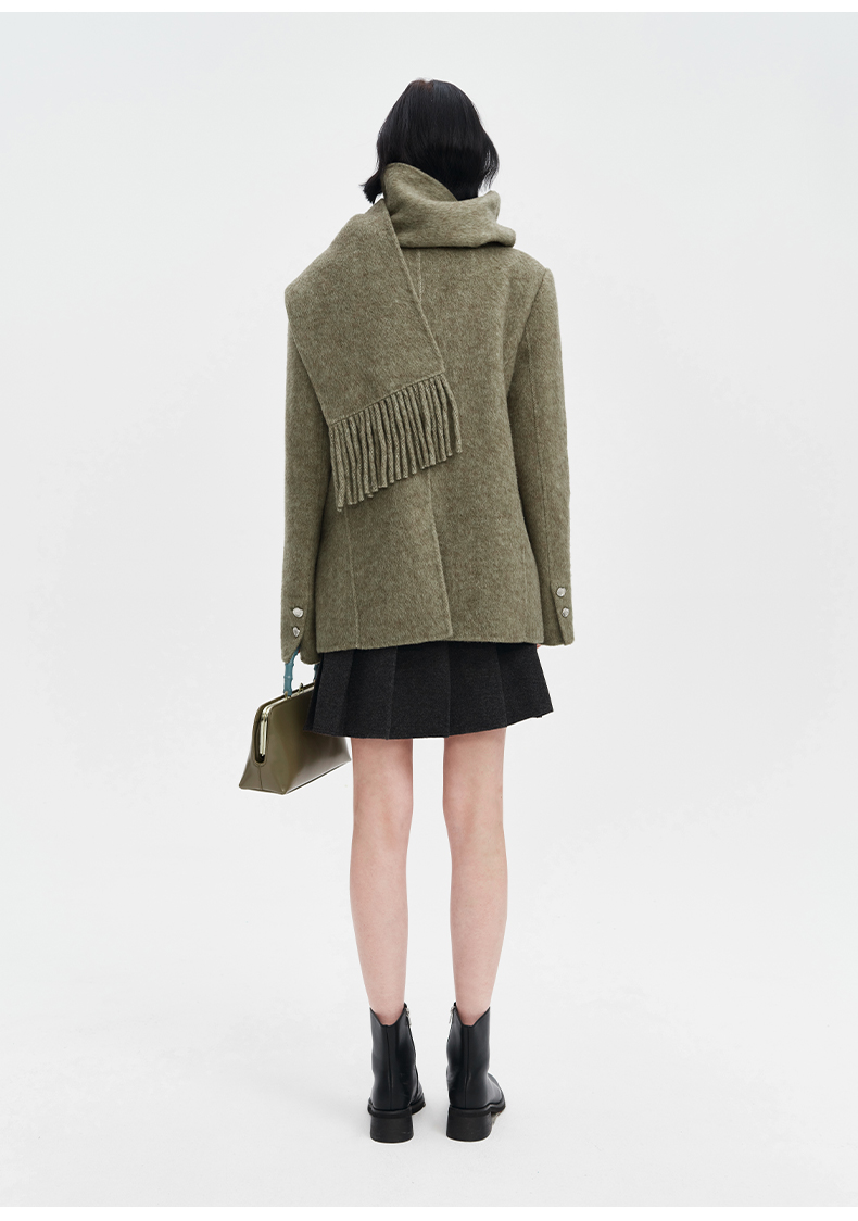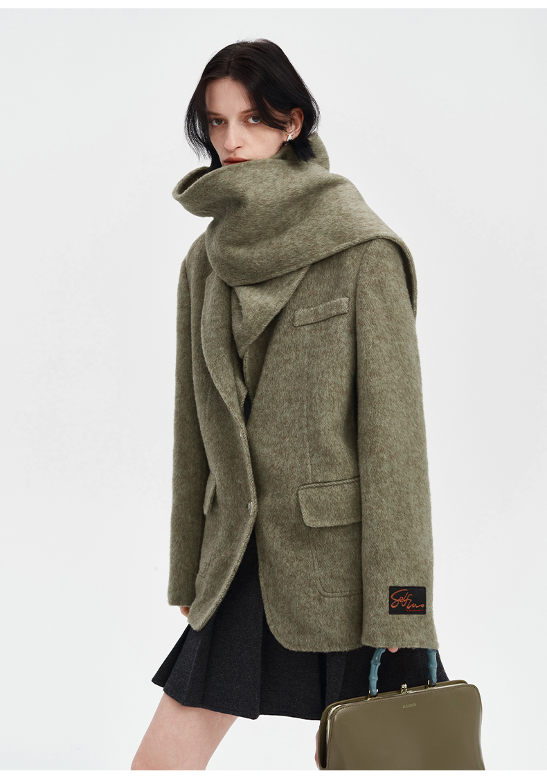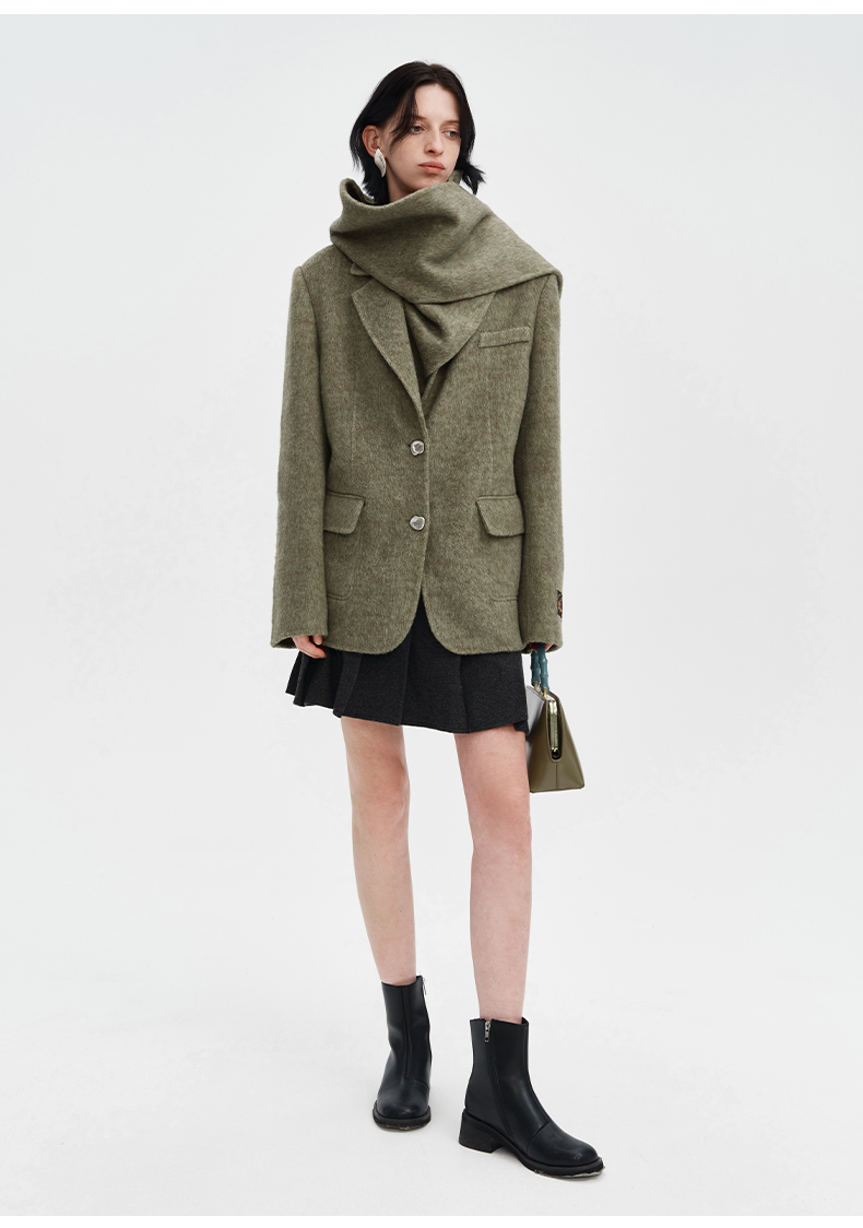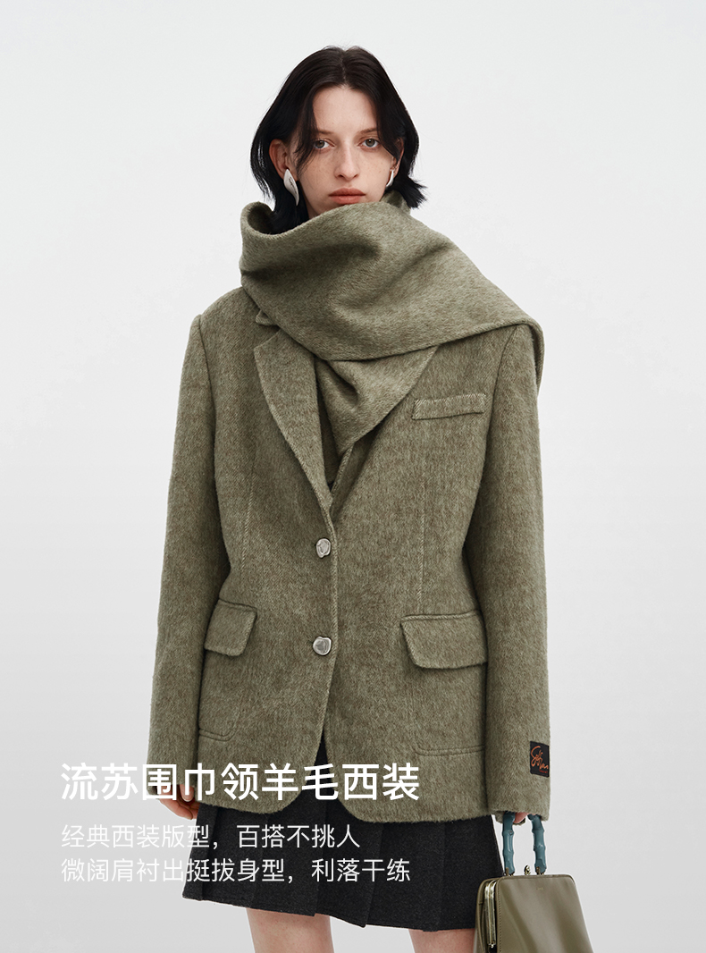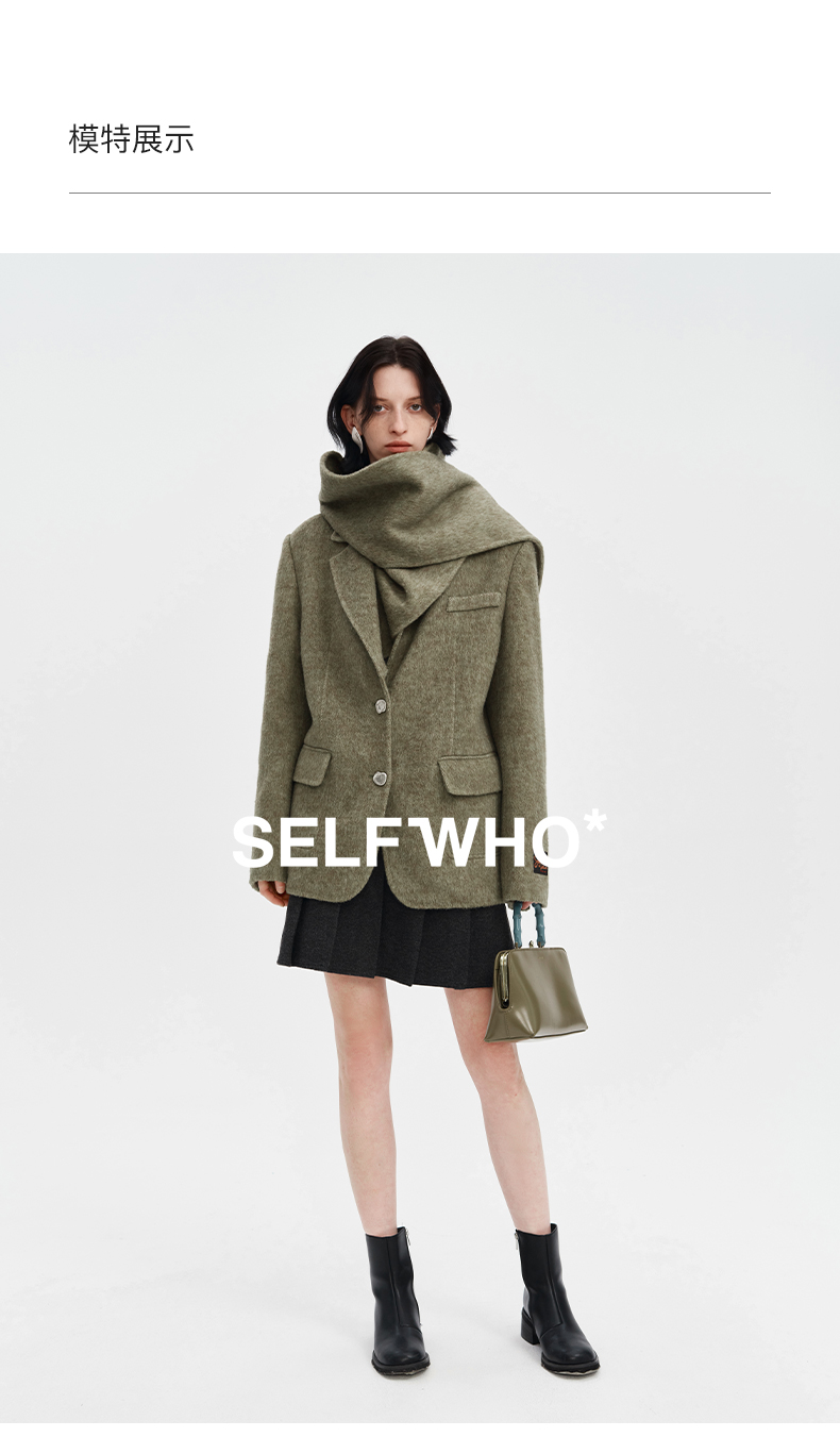 SELFWHO羊毛可拆卸流苏围巾领西装外套女2024冬圣诞气质西服外套