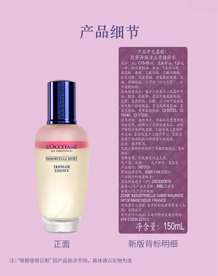 欧舒丹焕活三重精萃水150ml爽肤水化妆水滋润精华水护肤送男女友礼物 心选到家