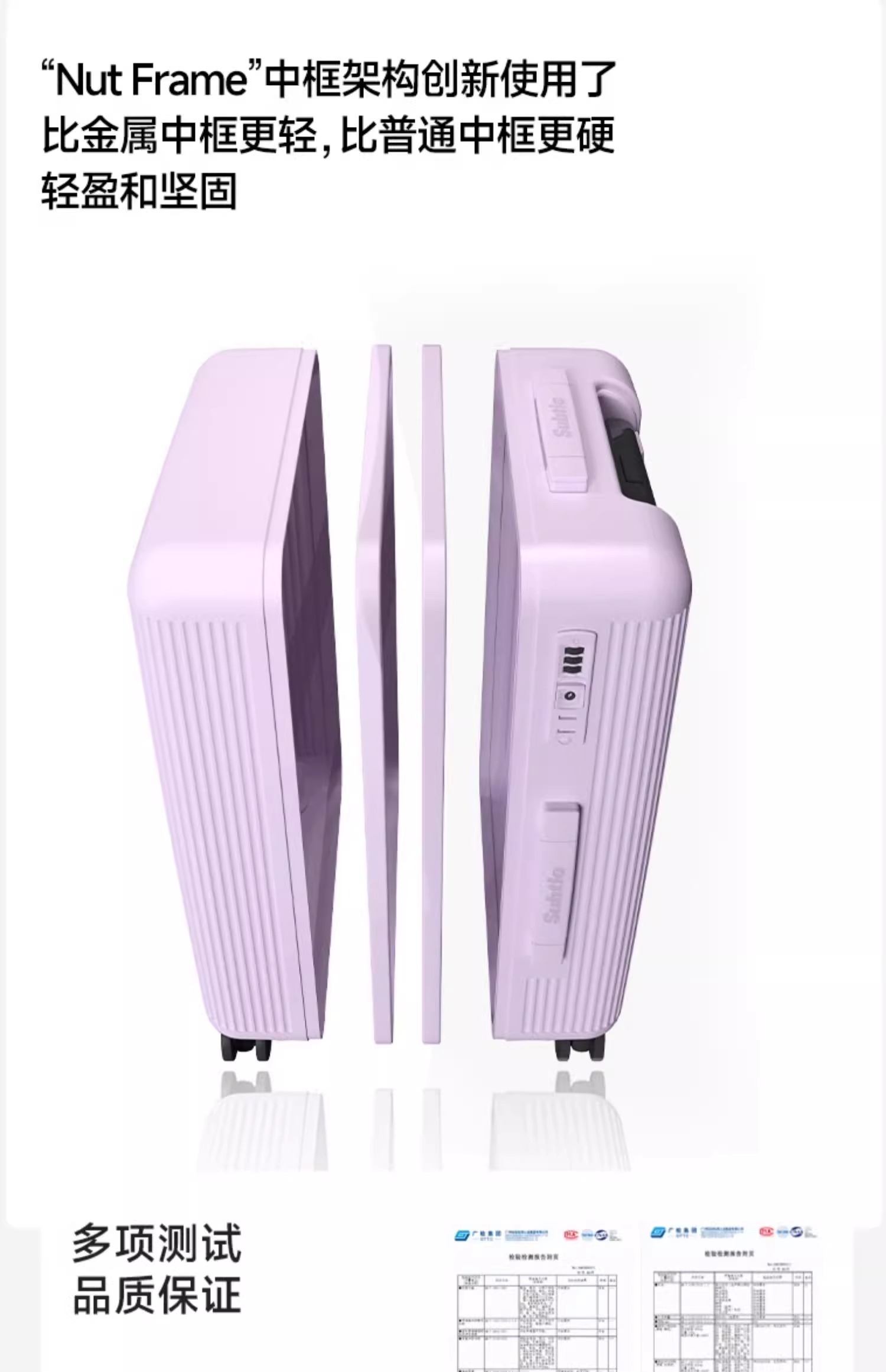 摒弃传统行李箱拼接车缝的短板,采用专利一体成型中框架构,边缝纹丝不动,用力撕扯、挤压都毫无缝隙,密封性和稳固性拉满