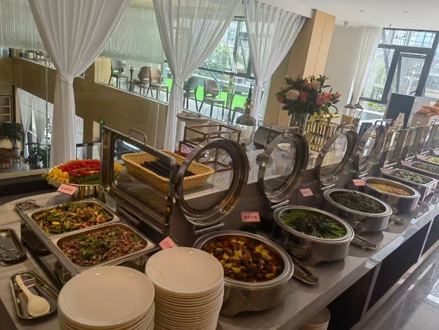 提供自助早餐,正餐为分餐制,正餐为 3 荤 3 素 1 汤 1 水果 1 面点荤素搭配营养卫生