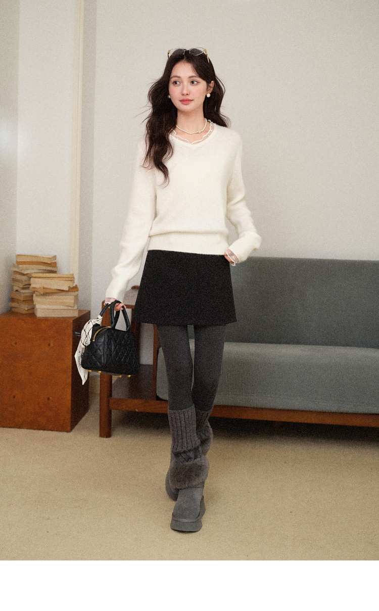 鹿向南「软糯棉花」杏色蕾丝拼接长袖针织毛衣女秋冬宽松叠穿上衣