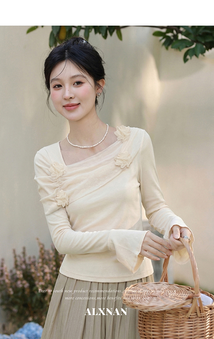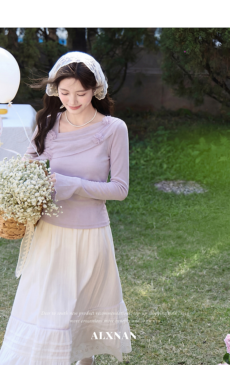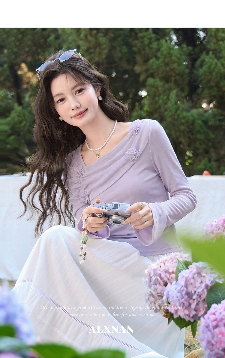 鹿向南「琉璃花海」法式设计感紫色T恤女春小众气质修身短款上衣
