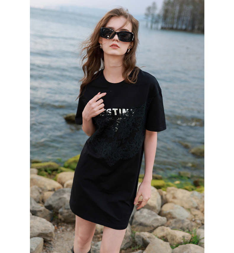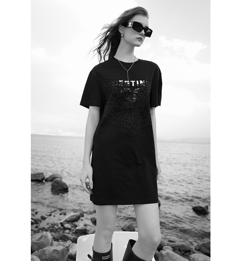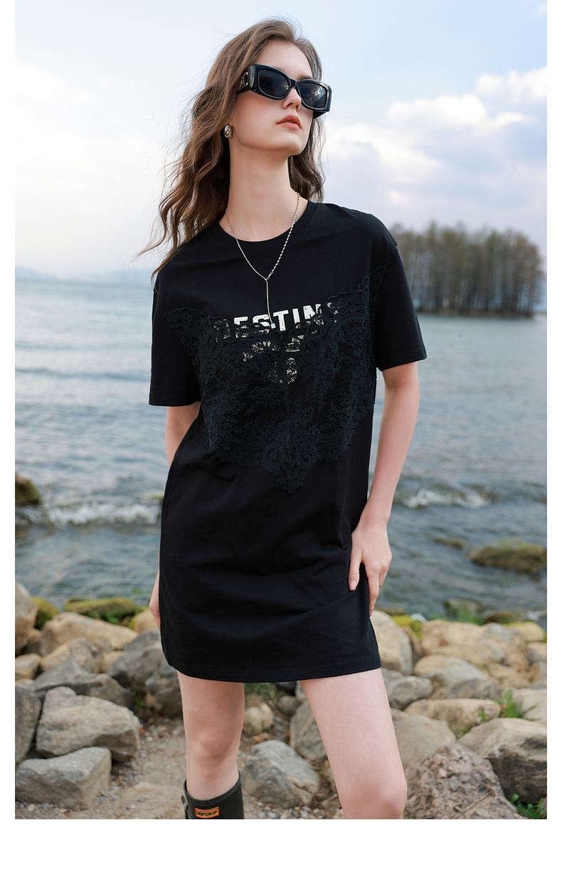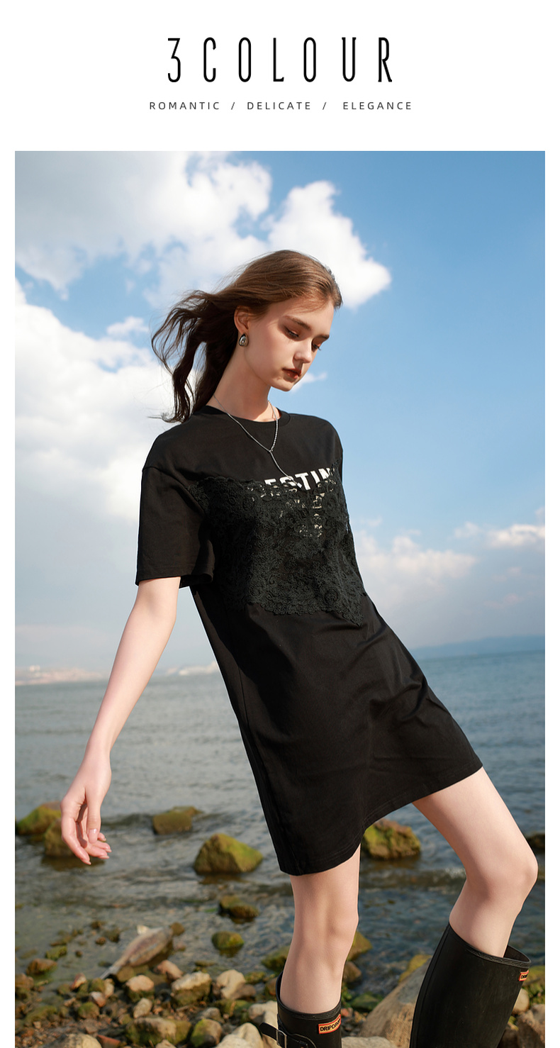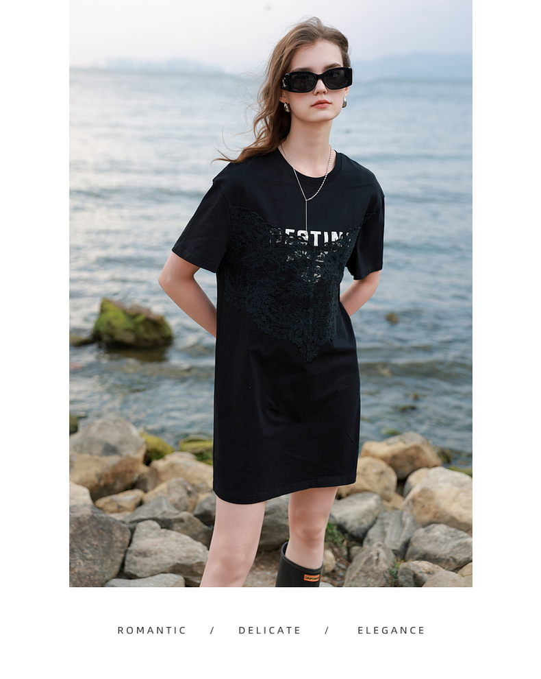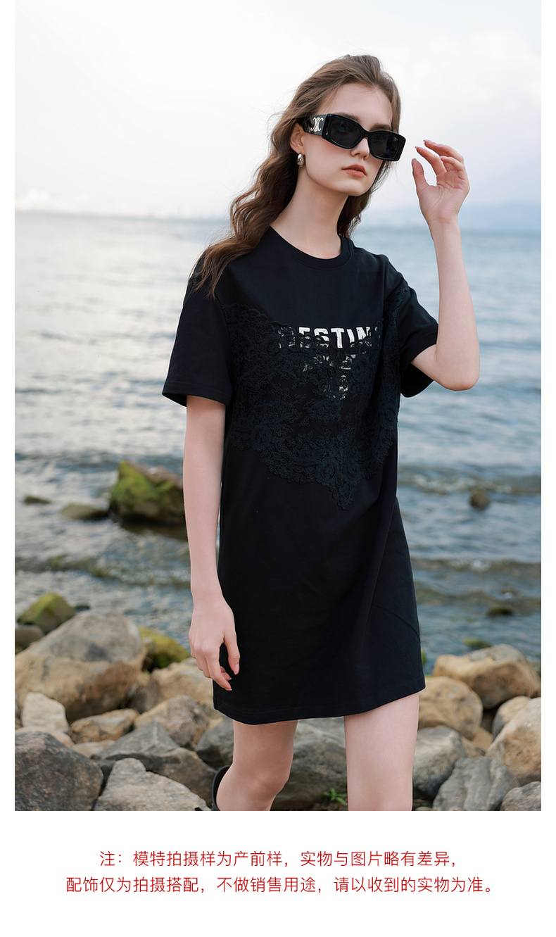 三彩2025夏季新款休闲T恤裙蕾丝拼接字母印花圆领宽松短裙M
