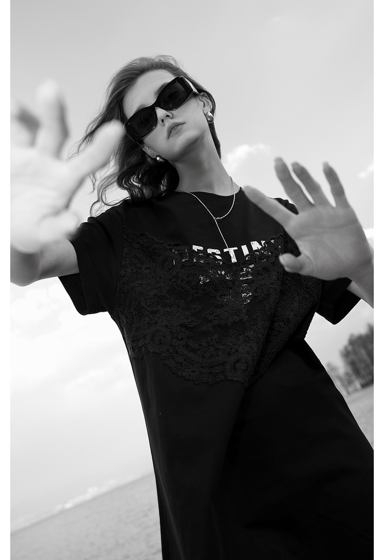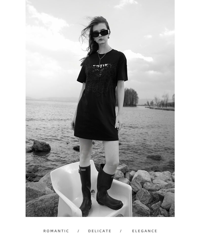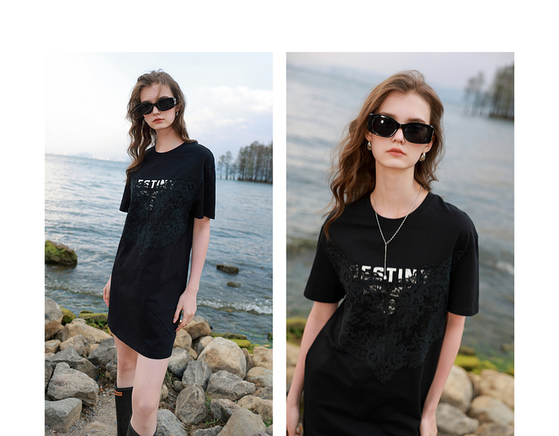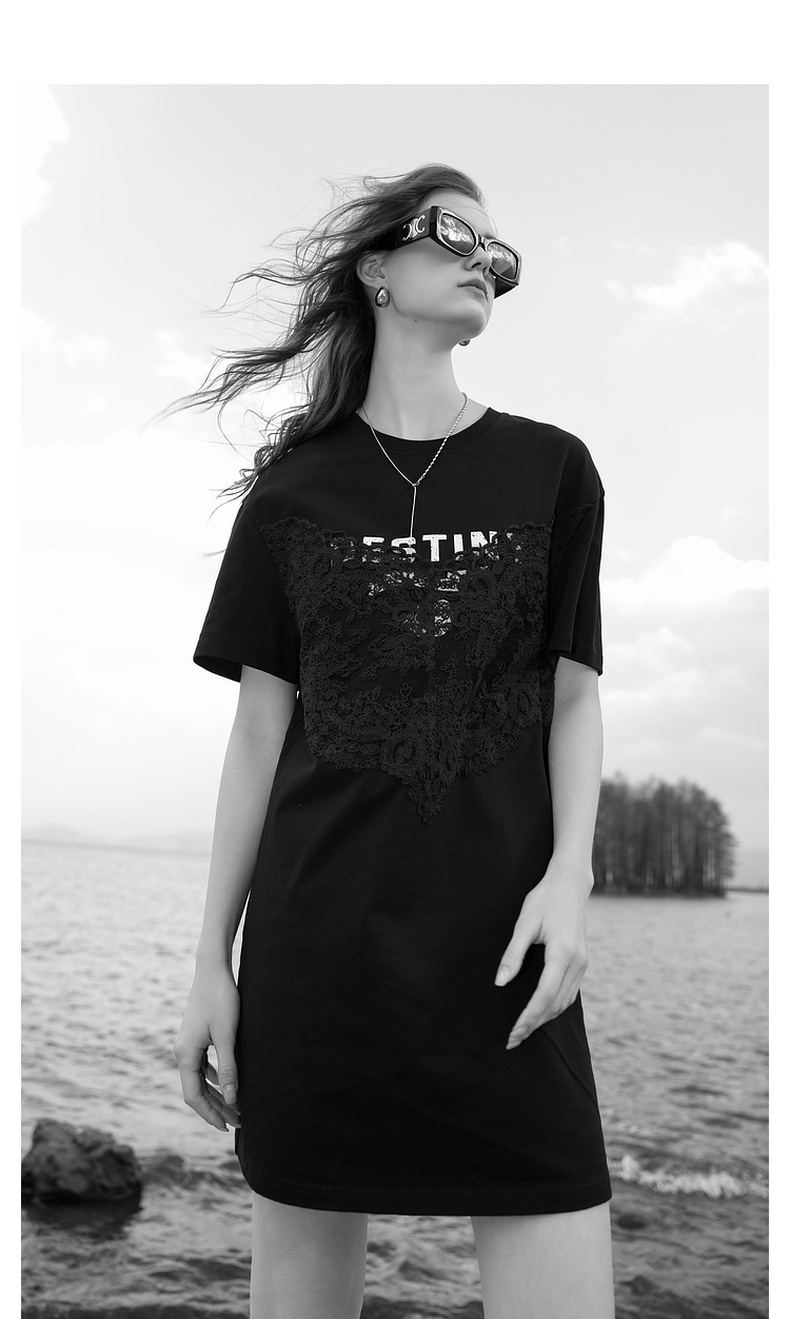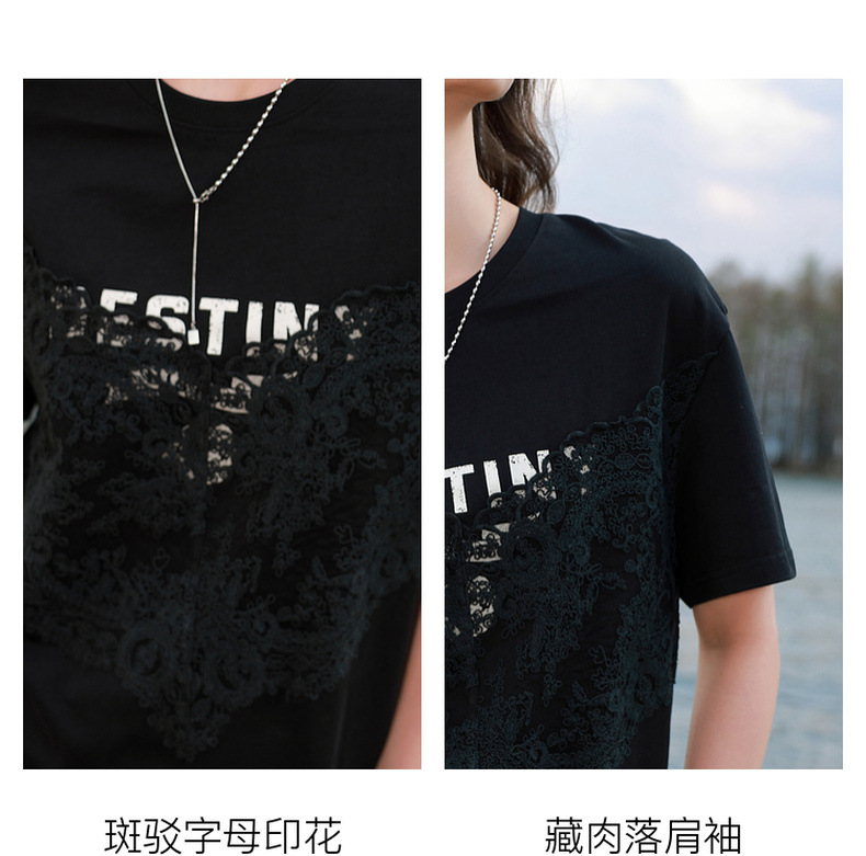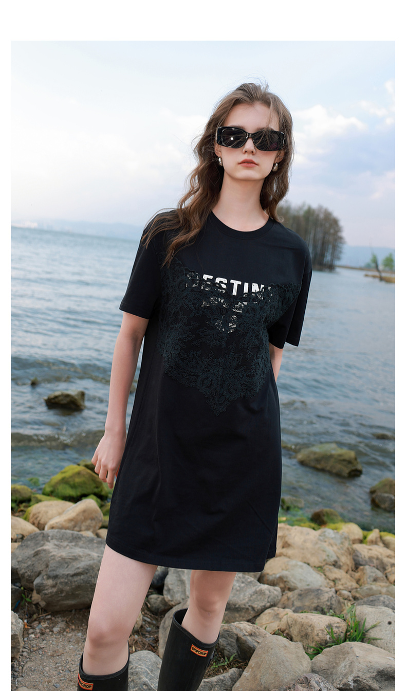 三彩2025夏季新款休闲T恤裙蕾丝拼接字母印花圆领宽松短裙M