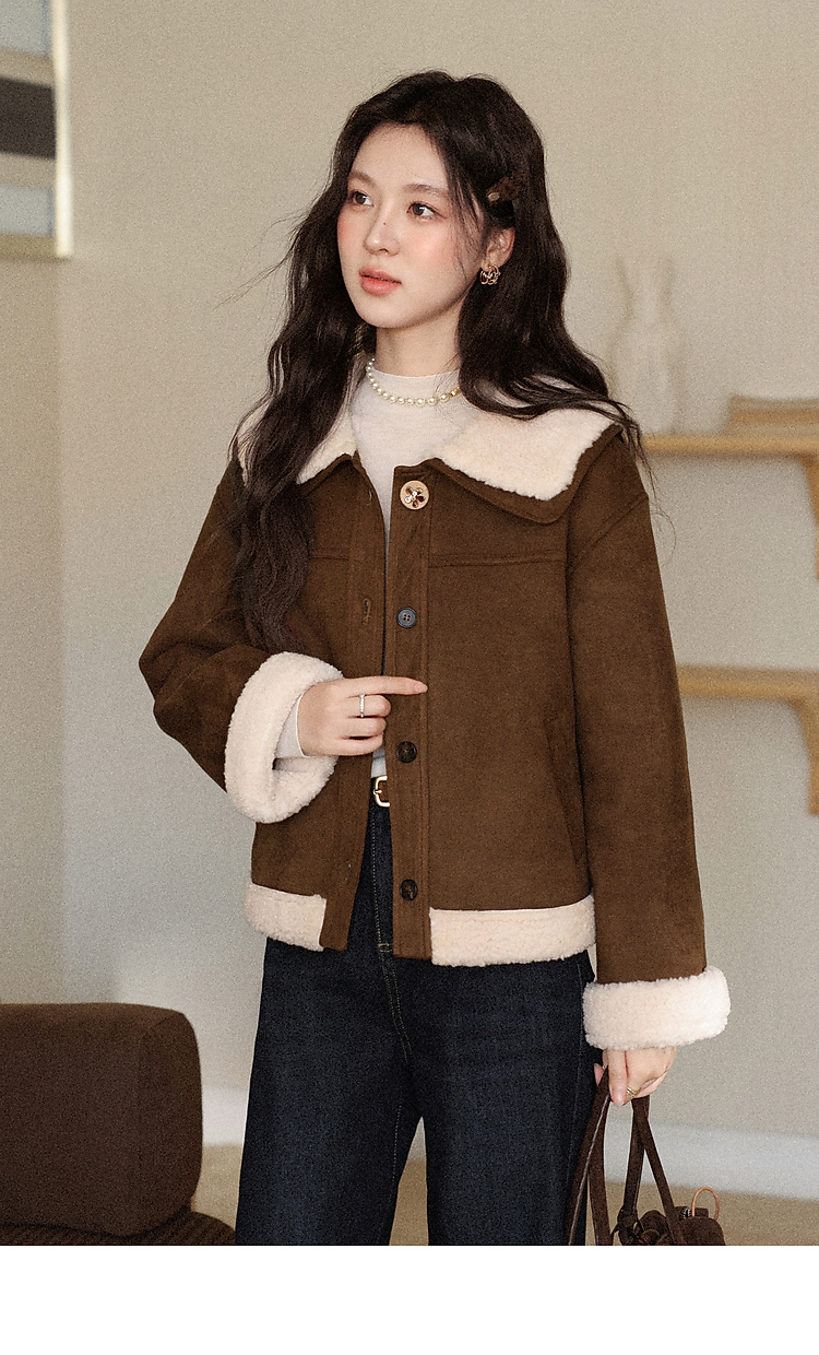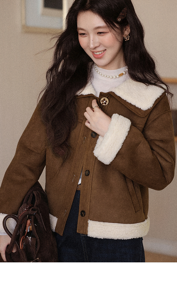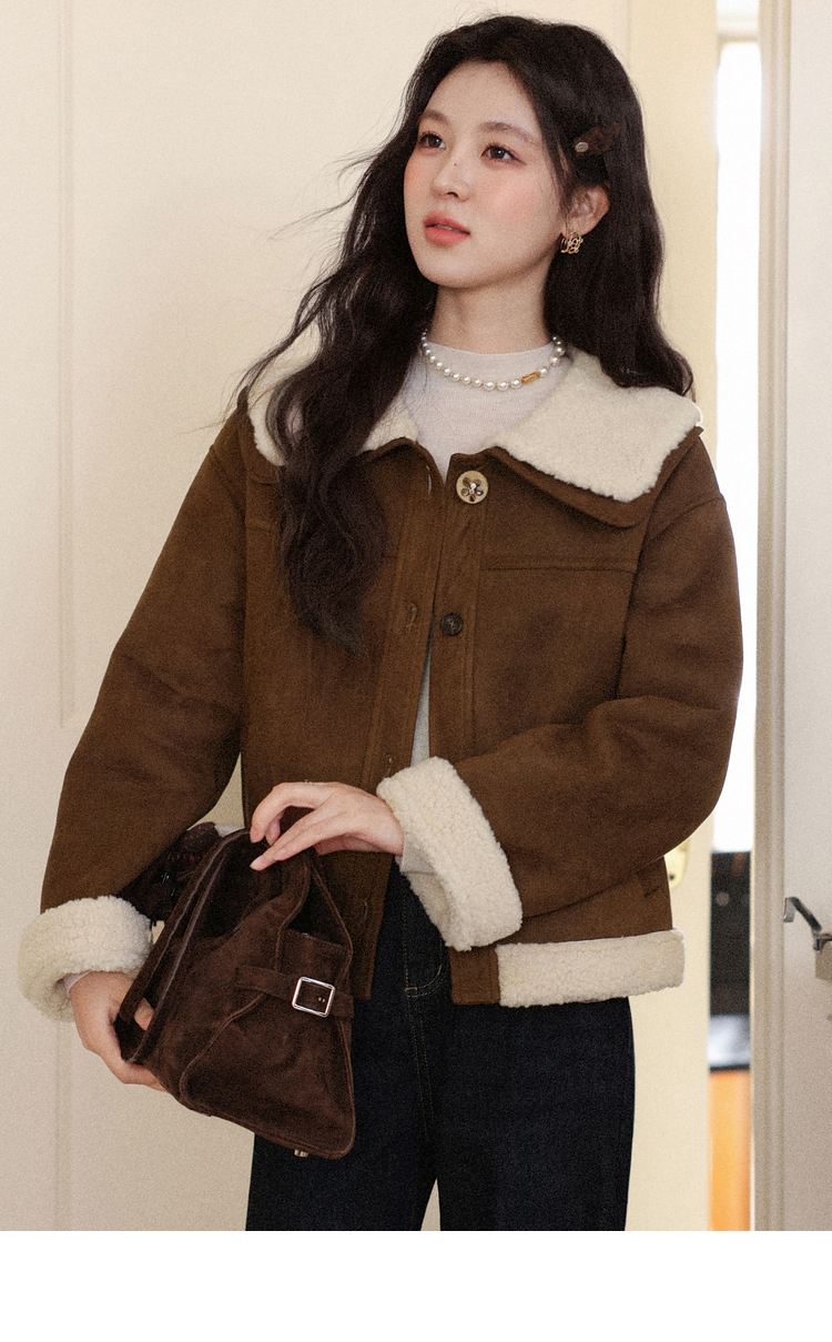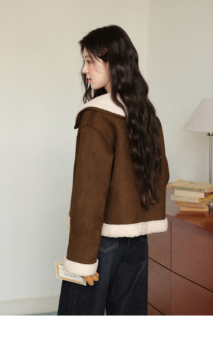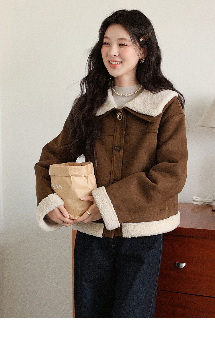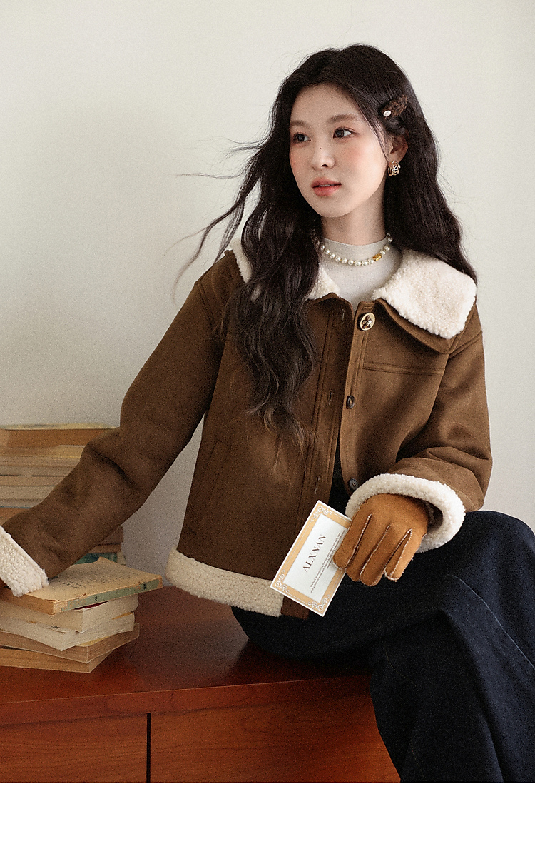 鹿向南「焦糖可颂」咖色保暖短款皮毛一体外套女秋冬翻领显瘦上衣
