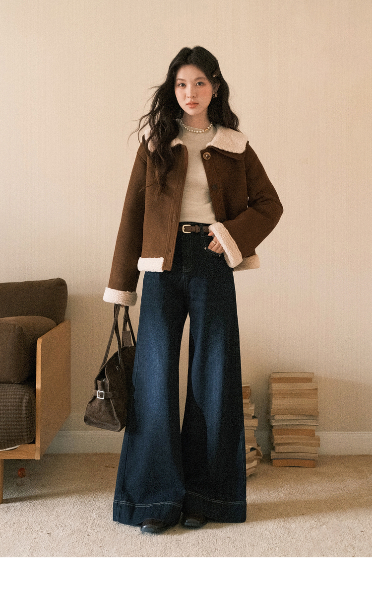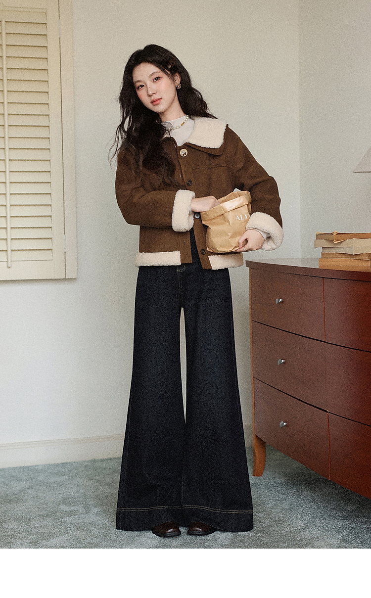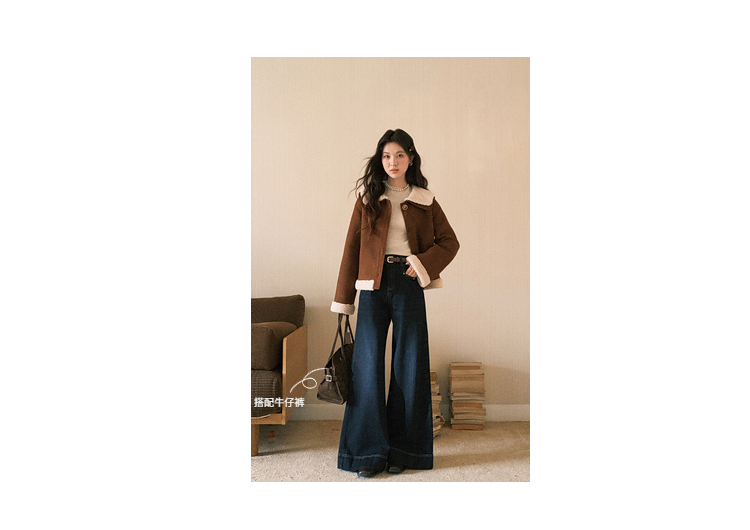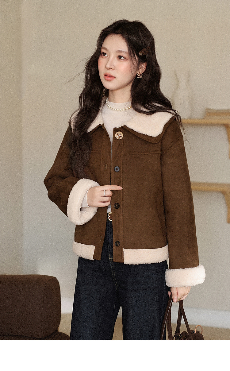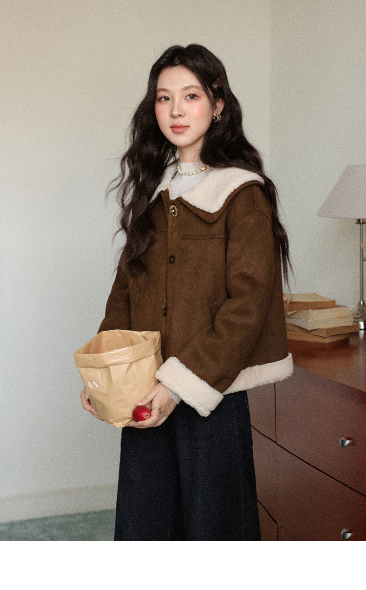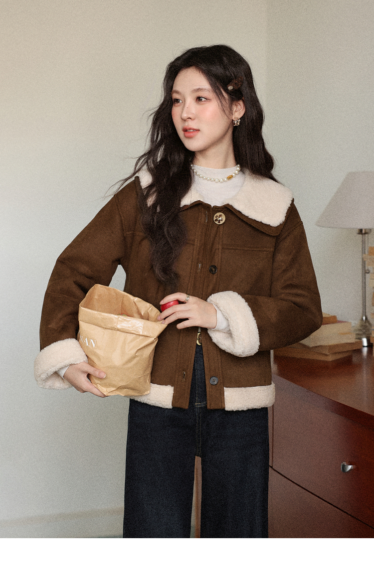 鹿向南「焦糖可颂」咖色保暖短款皮毛一体外套女秋冬翻领显瘦上衣