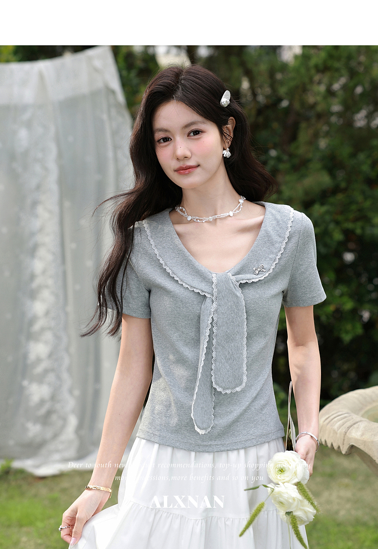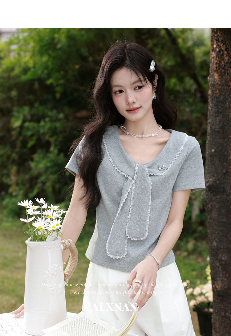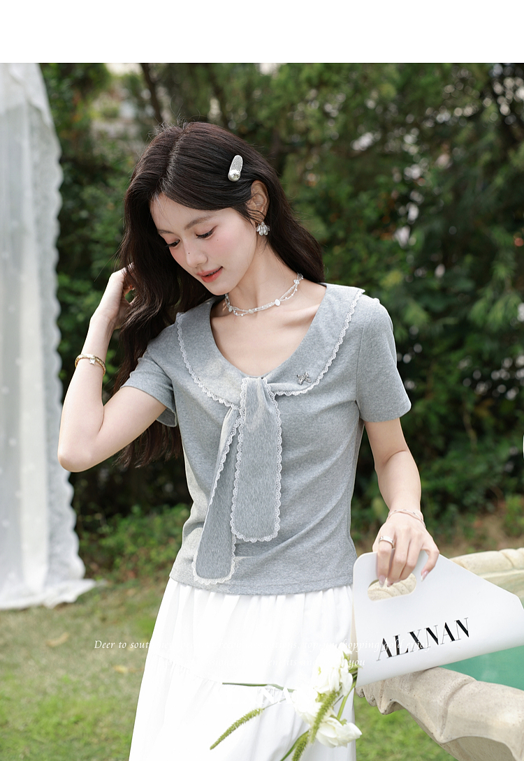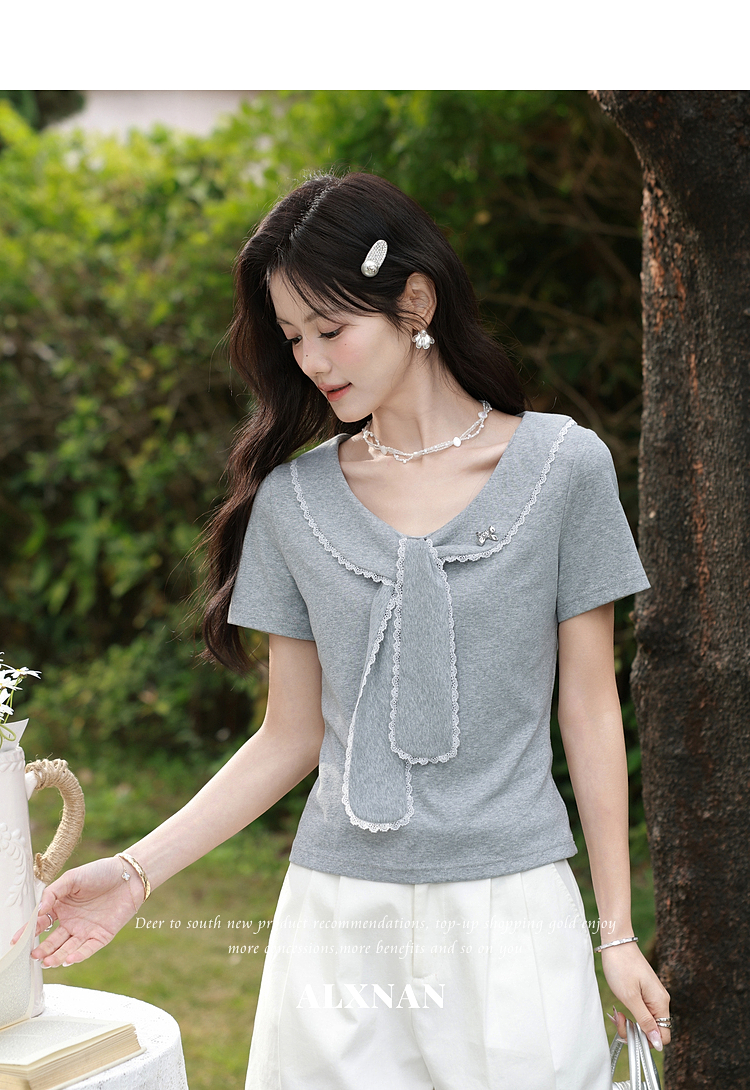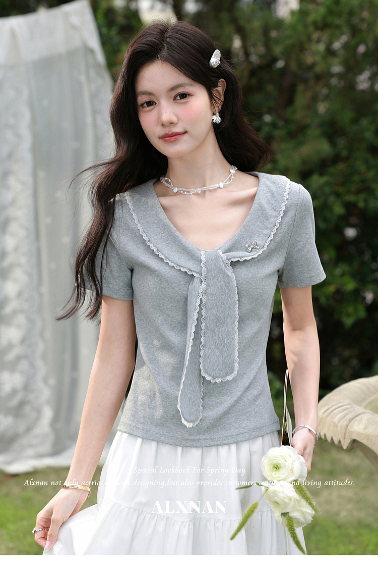 鹿向南「凉夏流云」灰色短袖T恤夏季新款时尚百搭设计感短上衣女