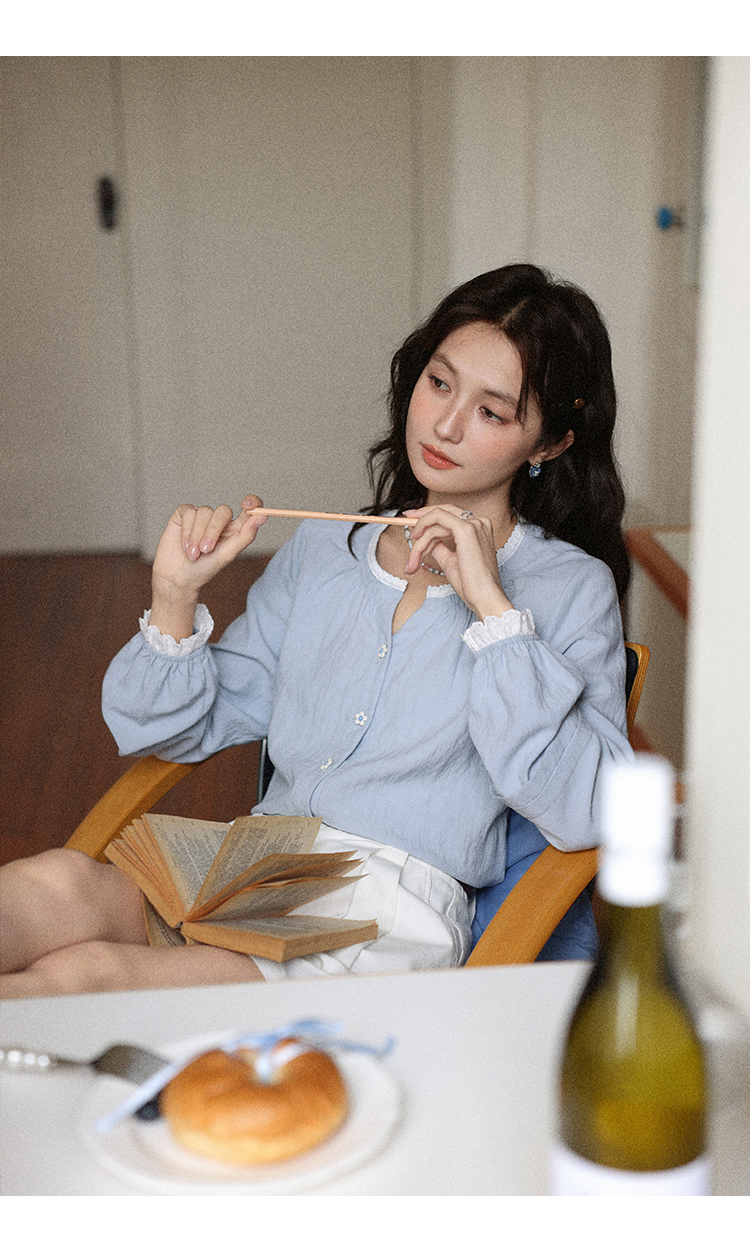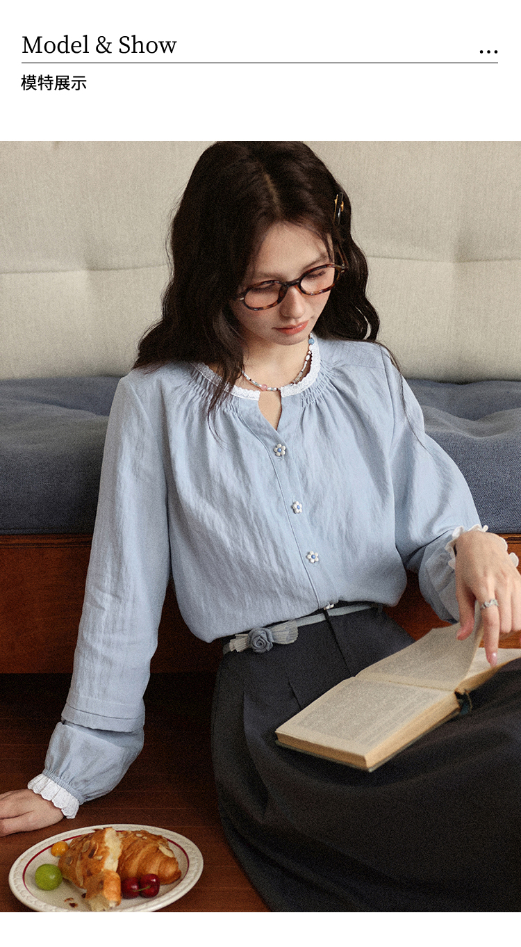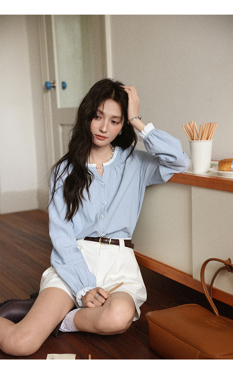 【6折秒杀】鹿向南「蓝岛之恋」蓝色法式长袖衬衫秋季新款休闲拼色通勤开衫女