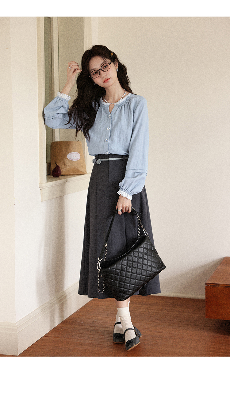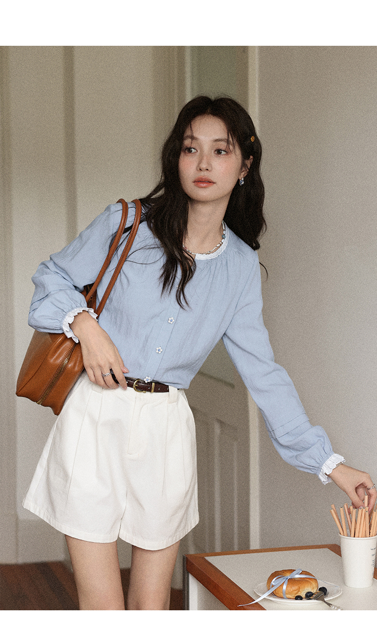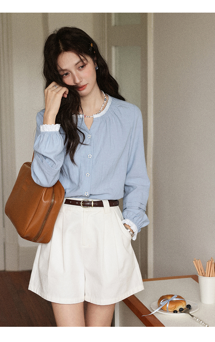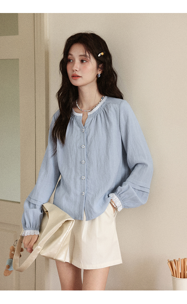 【6折秒杀】鹿向南「蓝岛之恋」蓝色法式长袖衬衫秋季新款休闲拼色通勤开衫女