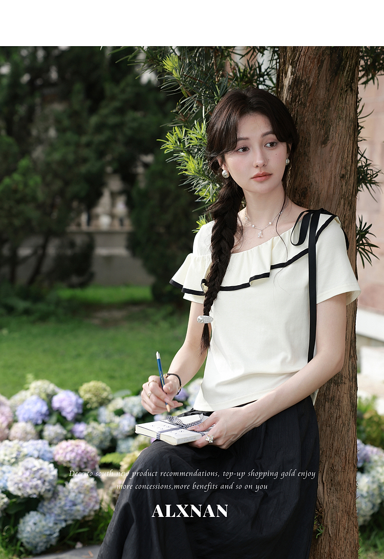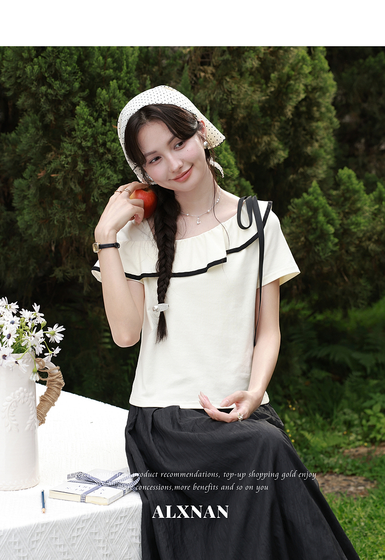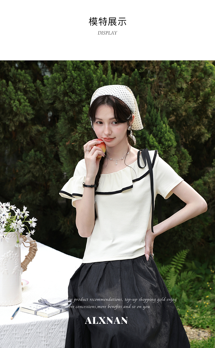 鹿向南「月落星沉」夏季新款法式荷叶边短袖T恤女士显瘦杏色上衣